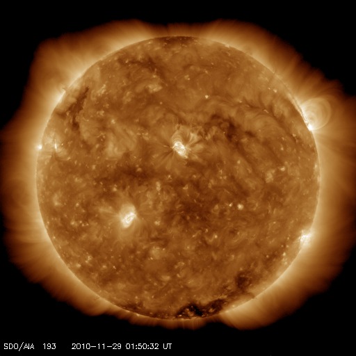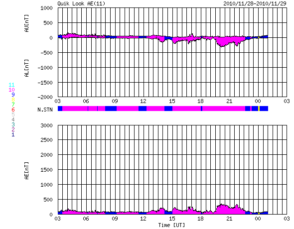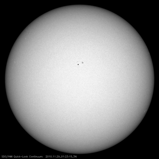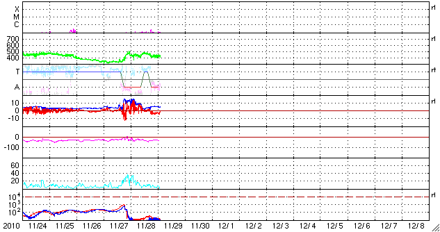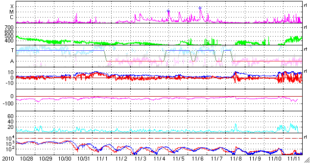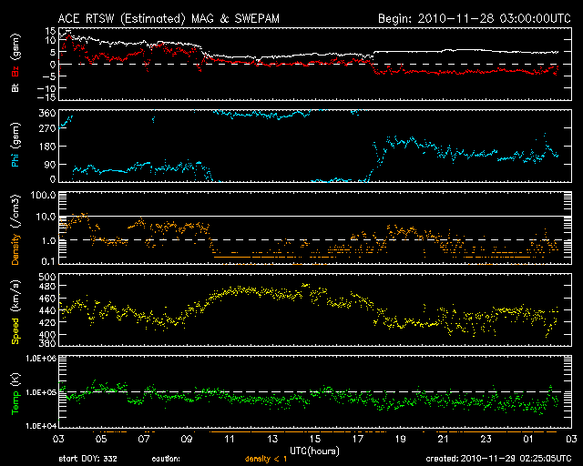 2010/11/29 11:25 更新 1130黒点群が現れました。弱い高速風は終わり、太陽風は平均的な速度に戻っています。 担当 篠原 太陽の中心付近に昨日現われた黒点群は、1130黒点群となりました。 Bクラスの小さなフレア活動を起こしているだけで、 今のところあまり活発ではありません。 その他も特に目立った領域はなく、太陽は静穏です。 太陽風は、今日に入った頃から速度が420〜440km/秒へ一段下がり、 昨日一日続いていた、やや高速という状態は終わりつつあります。 磁場強度は、速度が下がるのとは反対に、5nTと平均的な強さを回復しています。 そして、南北成分が-3nTと弱い南向きが続く様になっていますが、 AE指数では、200〜300nT程度の小さなオーロラ活動が発生している程度です。 これでコロナホールの影響が一段落ついたと考えると、 これから10日近く穏やかな太陽風が続きそうです。 SDOの太陽コロナ写真を見ると、北半球の東端(左端)に微かにコロナホールが見えている程度で、 次の高速風の到来は、この辺りの影響によるものと考えられます。 SDO衛星のAIA193カメラによる太陽コロナの様子 (c) SDO (NASA) ![]() SDO衛星による太陽の可視光写真 (c) SDO (NASA) ![]() GOES衛星の太陽X線データ (c) NOAA/SWPC ![]() ACEが観測した太陽風の磁場(1番上の枠、白線は全体の強度、赤線は南北成分) および、太陽風の密度(3番目の橙線)、速度(4番目の黄線) (c) NOAA/SWPC ![]() リアルタイムAE指数 下段のAEグラフの値が高くなると、オーロラ活動が活発化しています。 (c) 京都大学, NICT ![]() 27日の太陽周期に合わせたデータプロット 太陽が同じ面を地球に向けていた27日前の変化から、今後を予想することができます。 (c) 作図:宇宙天気ニュース