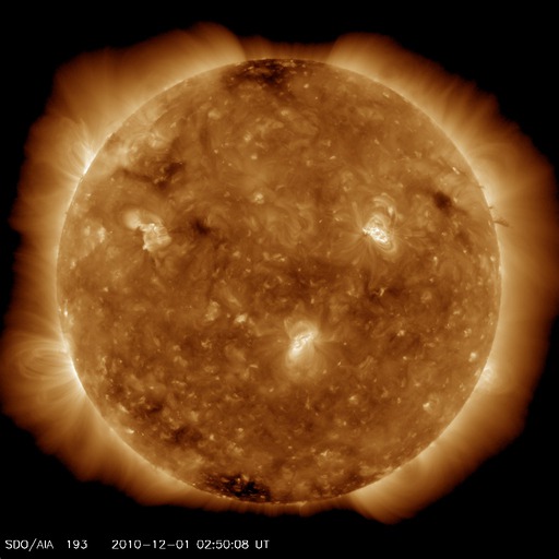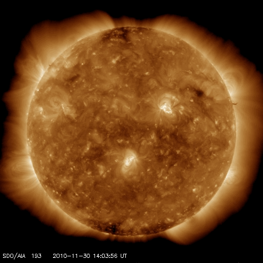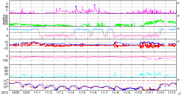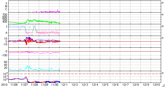 2010/12/ 1 12:09 更新 太陽で小規模の爆発現象があり、CMEが発生しているようです。太陽風は低速です。 担当 篠原 今日の早朝、12月1日5時半(世界時11月30日20時半)、 1130黒点群でB8と、もう少しでCクラスに達する小さなフレアが発生しました。 1130黒点群は昨日よりも少し大きくなっていますが、 フレア活動が特に活発化しているという様子は見られません。 このフレアの直前に、太陽の東側で別のフレアらしき爆発現象が発生しています。 SDO AIA193を見ると、小さな活動領域付近から 意外に派手な爆発が発生しています(動画を掲載します)。 この爆発によって、CME(太陽ガスの放出現象)が発生している様です。 AIA193の動画を見ると、ガスは幅広く噴き出していて、 地球方向にも影響が及びそうです。 その場合、12月4〜5日頃に太陽風の擾乱がやって来るのではないでしょうか。 擾乱は比較的小規模で、2日程度の規模でしょう。 それでも、速度や磁場の変動の具合では、ある程度活発なオーロラも期待できます。 ライブカメラなど楽しみにしてください。 現在の太陽風は、速度は340km/秒へ下がり、すっかり低速風となっています。 磁場強度も2nTに弱まって、太陽風は穏やかです。 先程のCMEの影響が見られるまで、太陽風は穏やかに推移すると思われます。 CMEの影響が通過した後も、またしばらく穏やかになりそうです。 SDO AIA 193による太陽活動の様子 (c) SDO (NASA)、動画加工 : 宇宙天気ニュース ![]() SDO衛星のAIA193カメラによる太陽コロナの様子 (c) SDO (NASA) ![]() SDO衛星による太陽の可視光写真 (c) SDO (NASA) ![]() GOES衛星の太陽X線データ (c) NOAA/SWPC ![]() ACEが観測した太陽風の磁場(1番上の枠、白線は全体の強度、赤線は南北成分) および、太陽風の密度(3番目の橙線)、速度(4番目の黄線) (c) NOAA/SWPC ![]() リアルタイムAE指数 下段のAEグラフの値が高くなると、オーロラ活動が活発化しています。 (c) 京都大学, NICT ![]() 27日の太陽周期に合わせたデータプロット 太陽が同じ面を地球に向けていた27日前の変化から、今後を予想することができます。 (c) 作図:宇宙天気ニュース