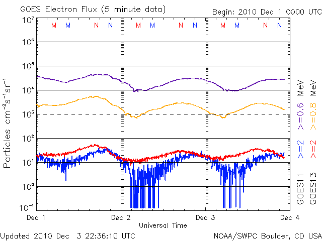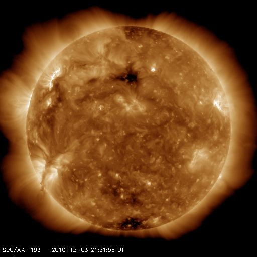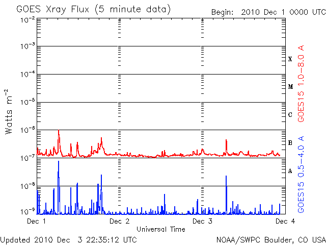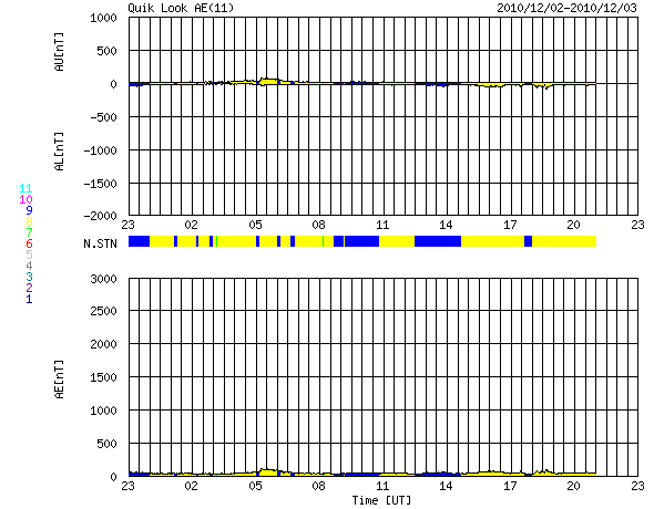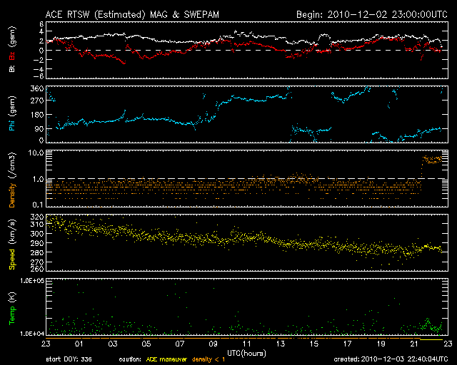 2010/12/ 4 07:40 更新 太陽風はかなり低速で、磁気圏も静かです。これから太陽風にCMEの影響が来るかもしれません。 担当 篠原 太陽から地球まで、宇宙天気は穏やかな状態です。 太陽風は一段と速度が下がって、280km/秒となっています。 かなり低速の状態です。 磁場強度も3nTと弱まったまま推移しています。 27日周期の図を見ると、セクターの境界をまたいだ様です。 しかし、太陽風に特に目立った変化はありません。 磁気圏のオーロラ活動も静かで、 AE指数は全く変化していません。 このまま穏やかに低速の太陽風が続くか、 30日に発生したCMEの影響がやって来るか、 今日、明日あたりの太陽風に注目してください。 また、SDO AIA193の太陽コロナによると、 太陽の北半球側の小さなコロナホールは、ちょうど太陽の中心にいます。 このため、3日後くらいにはここからの影響がやって来る可能性があります。 27日周期の図によると、4日後くらいになりそうですが、実際はどうなるでしょうか。 太陽は、北東(左上)の1131黒点群でB5の小さなフレアが単発で発生していますが、 変動はそれだけで、穏やかな状態です。 今日はこれから、「はやぶさ」のカプセルを見るために内之浦宇宙空間観測所へ行きます。 現地に行くだけで3時間くらいかかりそうですが、楽しみです。 SDO衛星のAIA193カメラによる太陽コロナの様子 (c) SDO (NASA) ![]() SDO衛星による太陽の可視光写真 (c) SDO (NASA) ![]() ACEが観測した太陽風の磁場(1番上の枠、白線は全体の強度、赤線は南北成分) および、太陽風の密度(3番目の橙線)、速度(4番目の黄線) (c) NOAA/SWPC ![]() リアルタイムAE指数 下段のAEグラフの値が高くなると、オーロラ活動が活発化しています。 (c) 京都大学, NICT ![]() GOES衛星による、静止衛星軌道における高エネルギー電子の変化 (c) NOAA/SWPC ![]() GOES衛星の太陽X線データ (c) NOAA/SWPC ![]() | ||||||||||||||||||||||||||||||||||||||||||||||||||||||||||||||||||||||||||||||||||||||||||||||||||||||||||||||||||||||||||||||||||||||||||||||||||||||||||||||||||||||||||||||||||||||||||||||||