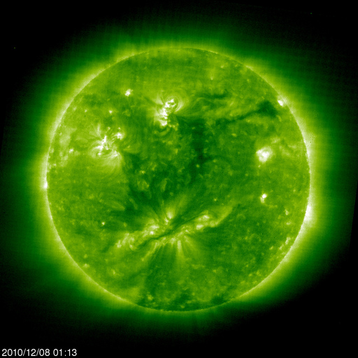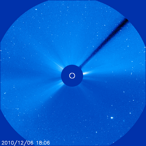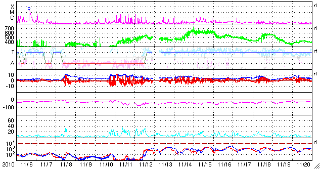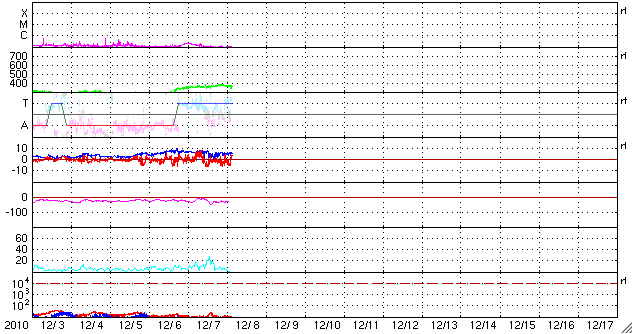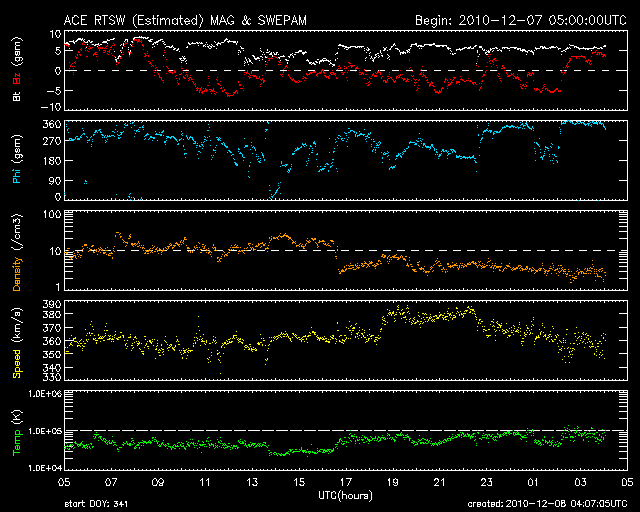 2010/12/ 8 13:08 更新 太陽風は低速のままですが、今後、コロナホールの影響で上昇する可能性があります。 担当 篠原 昨日のCME(太陽ガスの放出現象)の様子を、SOHO LASCO C3カメラの動画で紹介します。 太陽から南東(左下)に向かって、プラズマのかたまりが大きく噴き出しています。 この動画だと、地球へはほとんど向かっていない様です。 2〜3日後の太陽風に注目してみたいですが、 コロナホール起源の変化に混じってしまいそうです。 太陽は、1131、1133と、それぞれ大きな単一の黒点があるだけの群が2つ見えています。 X線の変動もなく、活動は静かです。 STEREO Behindで先回りをしても、活動的な領域はしばらく現われそうにありません。 太陽風は、一時的に速度380km/秒まで上がりましたが、 その前後は360km/秒と低速の状態が続いています。 磁場強度は5〜7nTとやや強まったままで、 まだこの後コロナホールの影響が強まって、速度が上がる可能性があります。 一方、太陽風磁場の南北成分は、0〜-5nTと小さい振幅ですが南寄りに推移しています。 このため、AE指数で300nTほどの小規模のオーロラ活動が連続しています。 この傾向はどこまで続くでしょうか。 SOHO EIT195の太陽コロナを見ると、 一昨日までフィラメントのあった領域が南半球側中央にやや明るく見え、 その北側にコロナホールが斜めに伸びています。 ちょうど太陽の中心をまたぐように伸びていて、 この影響が今後やって来るかもしれません。 これから5日程度先まで、高速風の傾向が続くかもしれません。 SOHO LASCO C3による、昨日のCMEの噴出の様子。 (c) SOHO (ESA & NASA)、動画加工 : 宇宙天気ニュース ![]() SOHO衛星のEIT195カメラによる太陽コロナの様子 (c) SOHO (ESA & NASA) ![]() SOHO衛星による太陽の可視光写真。マウスの矢印を写真に重ねると、黒点番号付きの写真に切り替わります。 (c) SOHO (ESA & NASA) ![]() GOES衛星の太陽X線データ (c) NOAA/SWPC ![]() ACEが観測した太陽風の磁場(1番上の枠、白線は全体の強度、赤線は南北成分) および、太陽風の密度(3番目の橙線)、速度(4番目の黄線) (c) NOAA/SWPC ![]() リアルタイムAE指数 下段のAEグラフの値が高くなると、オーロラ活動が活発化しています。 (c) 京都大学, NICT ![]() 27日の太陽周期に合わせたデータプロット 太陽が同じ面を地球に向けていた27日前の変化から、今後を予想することができます。 (c) 作図:宇宙天気ニュース