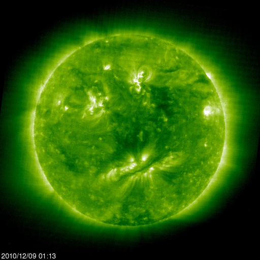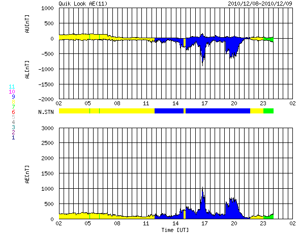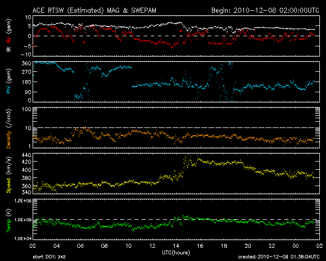 2010/12/ 9 10:39 更新 太陽風はやや低速です。明日以降、コロナホールの影響がやって来る可能性があります。 担当 篠原 太陽風の速度は、昨夜、一時的に420km/秒に上がりましたが、 5時間ほどで下がり始め、現在は370km/秒とやや低速の風に戻っています。 一方、磁場強度は徐々に下がっていて、4nTと弱めに変わっています。 今日いっぱいは、この状態で落ち着きそうです。 そして、明日以降は、SOHO EIT195の中心付近に見えるコロナホールの影響を受けそうです。 やや淡いですが、北半球から南半球へまたぐように斜めに広くコロナホールは延びています。 前周期は、600km/秒を超える規模の高速風がやって来ましたが、 今回はどうなるでしょうか。 明日以降、4〜5日程度影響が続きそうです。 オーロラは、AE指数で500〜1000nTの中規模の活動が発生しています。 速度は400km/秒程でしたが、磁場が-5nT近く南向きになったことが効いたようです。 明日以降は、コロナホールの影響がやって来る可能性があり、 オーロラの活動も期待できます。 太陽は、黒点群に特に変化はなく、 静穏な状態が続いています。 SOHO EIT195を見ると、2日前にフィラメントが飛び出した南半球の領域に、 また新しくフィラメントが発生しつつあるようです。 まだはっきりしませんが、しばらく注目して下さい。 SOHO衛星のEIT195カメラによる太陽コロナの様子 (c) SOHO (ESA & NASA) ![]() SOHO衛星による太陽の可視光写真。マウスの矢印を写真に重ねると、黒点番号付きの写真に切り替わります。 (c) SOHO (ESA & NASA) ![]() ACEが観測した太陽風の磁場(1番上の枠、白線は全体の強度、赤線は南北成分) および、太陽風の密度(3番目の橙線)、速度(4番目の黄線) (c) NOAA/SWPC ![]() リアルタイムAE指数 下段のAEグラフの値が高くなると、オーロラ活動が活発化しています。 (c) 京都大学, NICT ![]() 27日の太陽周期に合わせたデータプロット 太陽が同じ面を地球に向けていた27日前の変化から、今後を予想することができます。 (c) 作図:宇宙天気ニュース