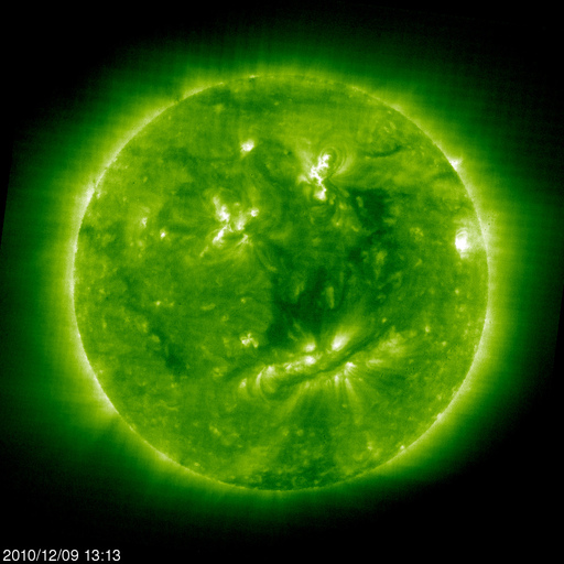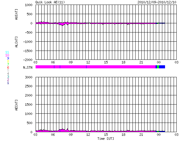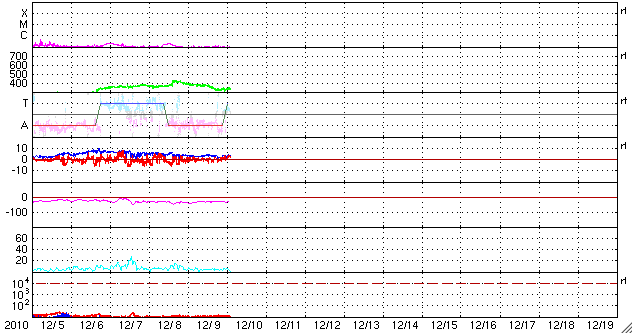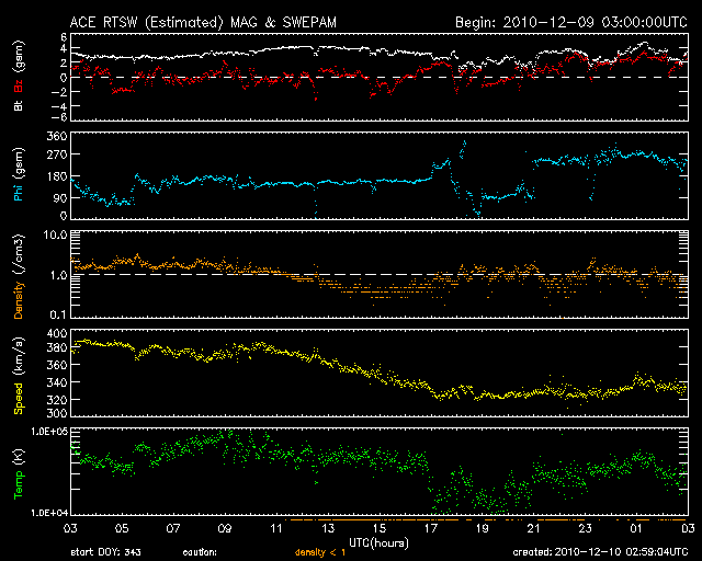 2010/12/10 11:30 更新 低速の太陽風が続いています。コロナホールの影響はまだ到来していません。 担当 篠原 太陽風の速度は340km/秒へ下がり、低速風となっています。 磁場強度も、3〜4nTと弱めで推移していて、 今のところ変化が始まる気配は見られません。 SOHO EIT195を見ると、 太陽の中心部に斜めに暗く広がっているコロナホールは、 次第に太陽の西側(右側)半分へ迫り出していて、 そろそろ影響が地球へやって来てもよさそうです。 27日周期の図を参照すると、 27日前の前周期は既に高速太陽風が始まっていました(11月11日以降)。 しかし、前周期通りには変化しないのが、最近の太陽風の特徴で、 予想する側にとっては難しい状況が続いています。 これから4〜5日間にわたって、コロナホールの影響はどの程度やって来るでしょうか。 現在の磁気圏活動はとても静かです オーロラの活動度を示すAE指数は、全く変化していません。 太陽も穏やかに推移しています。 1131、1133黒点群の大きな黒点は、それぞれほとんど変化はなく、 X線のグラフにも、変化は見られません。 SOHO衛星のEIT195カメラによる太陽コロナの様子 (c) SOHO (ESA & NASA) ![]() SOHO衛星による太陽の可視光写真。マウスの矢印を写真に重ねると、黒点番号付きの写真に切り替わります。 (c) SOHO (ESA & NASA) ![]() ACEが観測した太陽風の磁場(1番上の枠、白線は全体の強度、赤線は南北成分) および、太陽風の密度(3番目の橙線)、速度(4番目の黄線) (c) NOAA/SWPC ![]() リアルタイムAE指数 下段のAEグラフの値が高くなると、オーロラ活動が活発化しています。 (c) 京都大学, NICT ![]() 27日の太陽周期に合わせたデータプロット 太陽が同じ面を地球に向けていた27日前の変化から、今後を予想することができます。 (c) 作図:宇宙天気ニュース