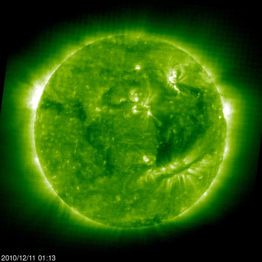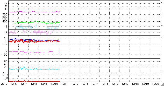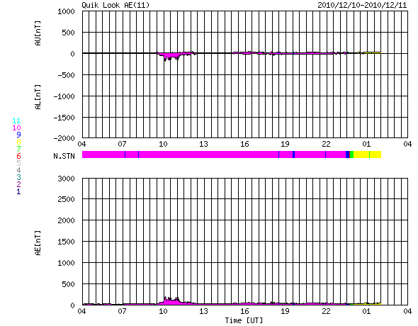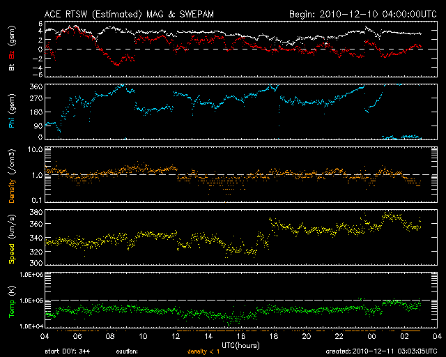 2010/12/11 12:04 更新 太陽風は300km/秒台中盤と低速のままです。コロナホールの影響はまだです。 担当 篠原 低速の太陽風が続いています。 昨日より、340km/秒から360km/秒と300km/秒台中盤で落ち着いています。 磁場強度も3〜4nTと弱めの状態で安定していて、 コロナホールの影響が始まる気配はまだ見られません。 SOHO EIT195の太陽コロナ写真では、 西半球側(右側)のコロナホールは、影響開始の目安の位置に十分達しています。 コロナホールが赤道をはさんで南北に広がっていることや、 濃さなどから考えて、地球へ影響がやって来る可能性は高いと思います。 引き続き、太陽風の変化に注目してください。 太陽風の磁場強度が強まり始めると、変動の始まりです。 磁場の南北成分が南寄りになると、 磁場強度が高まっているためにより大きな南向きになりやすく、 速度の上昇と重なって、活発なオーロラの発生が期待できます。 ライブカメラ(もちろん現地もですが)で狙うならば、この立ち上がりの時間帯です。 現在の磁気圏活動は、とても静かです。 AE指数はほとんど変化していません。 太陽の活動も穏やかです。 中央線の南半球側に、微かに新しい黒点が現われているようですが、 特に番号などは付いていないようです。 SDOの最新写真では、既に消えています。 SOHO衛星のEIT195カメラによる太陽コロナの様子 (c) SOHO (ESA & NASA) ![]() SOHO衛星による太陽の可視光写真。マウスの矢印を写真に重ねると、黒点番号付きの写真に切り替わります。 (c) SOHO (ESA & NASA) ![]() ACEが観測した太陽風の磁場(1番上の枠、白線は全体の強度、赤線は南北成分) および、太陽風の密度(3番目の橙線)、速度(4番目の黄線) (c) NOAA/SWPC ![]() リアルタイムAE指数 下段のAEグラフの値が高くなると、オーロラ活動が活発化しています。 (c) 京都大学, NICT ![]() 27日の太陽周期に合わせたデータプロット 太陽が同じ面を地球に向けていた27日前の変化から、今後を予想することができます。 (c) 作図:宇宙天気ニュース
