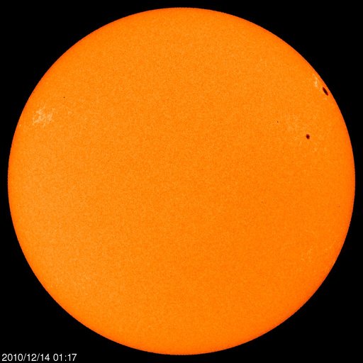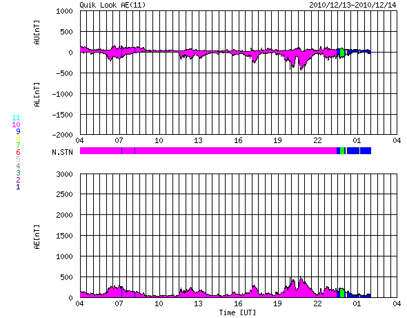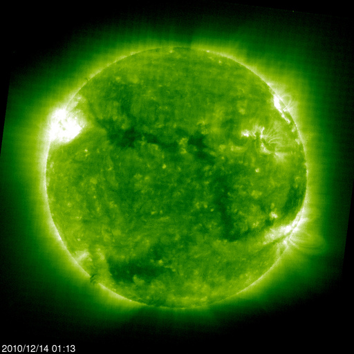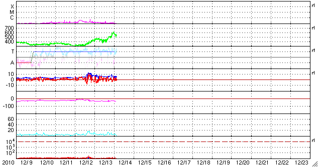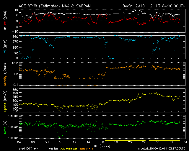 2010/12/14 12:18 更新 太陽風は550km/秒の高速風になりました。磁気圏活動は低めです。 担当 篠原 太陽風は、今日に入った頃から更に速度が上昇を始め、 今朝、14日8時(世界時13日23時)には600km/秒にまで達しました。 そこを最高速度として、以降、550km/秒で推移しています。 太陽風は、ようやく高速風になりました。 27日周期の図で、前周期の速度変化と比較して下さい。 ずいぶん大きく変わっています。 SOHO EIT195を見ると、細長いコロナホールが、太陽の西から東へ、 折れ曲がるように伸びています。 この領域の影響で、このまま高速状態がしばらく続く可能性があります。 どの程度の速度が保たれるか、ACEのデータに注目してください。 速度が上がり、磁気圏のオーロラ活動もざわついています。 AE指数では、300〜500nTほどの小さな活動ですが、頻繁に発生しています。 現在の太陽風の磁場強度は5nTです。 この程度あれば、南向きが強まることで活発なオーロラが発生する可能性があります。 太陽では、1134、1135と2つの黒点群が新たに発生しています。 1134群は、西寄りの黒点のすぐ左に見える小さな点です。 1135群は、東から上がってきた活動領域ですが、 掲載の写真では黒点を見つけることはできません(白斑が見えています)。 X線のデータは静穏で、太陽の活動度は低いままです。 SOHO衛星のEIT195カメラによる太陽コロナの様子 (c) SOHO (ESA & NASA) ![]() SOHO衛星による太陽の可視光写真。マウスの矢印を写真に重ねると、黒点番号付きの写真に切り替わります。 (c) SOHO (ESA & NASA) ![]() ACEが観測した太陽風の磁場(1番上の枠、白線は全体の強度、赤線は南北成分) および、太陽風の密度(3番目の橙線)、速度(4番目の黄線) (c) NOAA/SWPC ![]() リアルタイムAE指数 下段のAEグラフの値が高くなると、オーロラ活動が活発化しています。 (c) 京都大学, NICT ![]() 27日の太陽周期に合わせたデータプロット 太陽が同じ面を地球に向けていた27日前の変化から、今後を予想することができます。 (c) 作図:宇宙天気ニュース