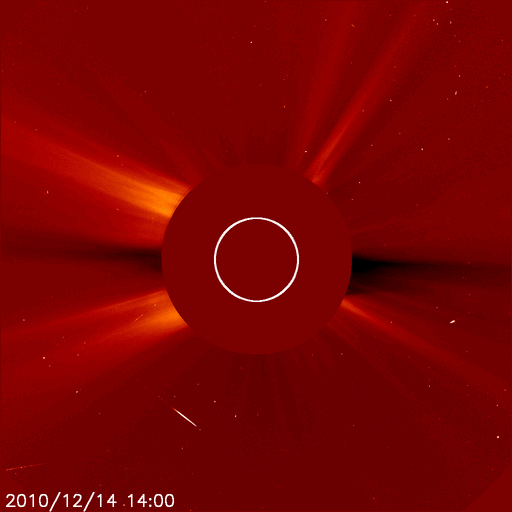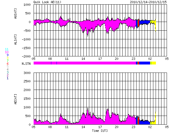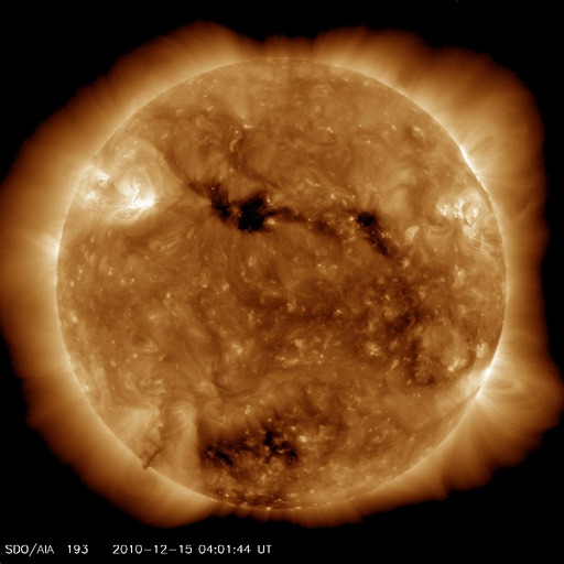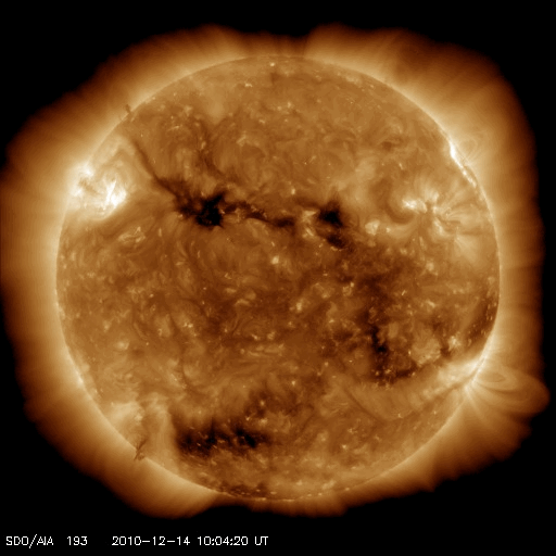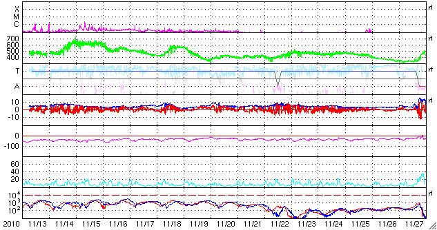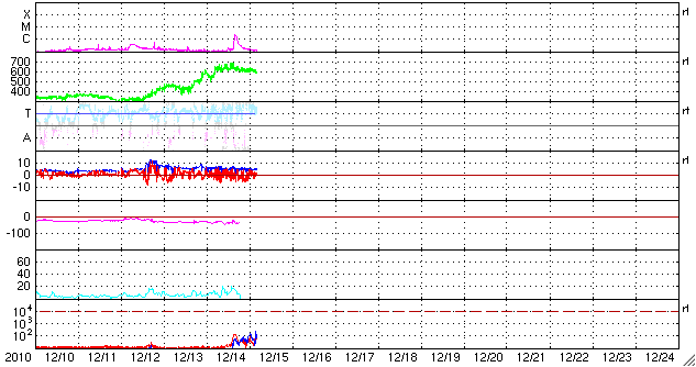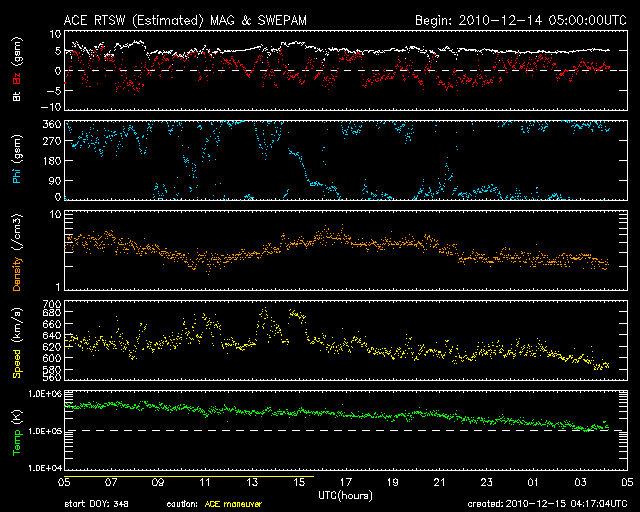 2010/12/15 13:17 更新 太陽風は600km/秒台の高速風になり、オーロラの活動も強まっています。 担当 篠原 太陽の北西部で、フィラメントの噴出現象が発生しました。 SDOのAIAカメラによる動画を掲載します。 この変化に伴ってX線にC2.3の小規模フレアが観測されています。 また、CME(太陽ガスの放出現象)も発生していて、 SOHO LASCO C2でガスの噴出を見ることができます。 地球からは斜め方向に飛び出しているので、地球への影響はありません。 黒点は、1131黒点群が西の端に没して、 1133黒点群だけが残っています。 活動度は低く、太陽は穏やかです。 太陽風は、昨日のニュースの後に600km/秒台へ速度が高まりました。 コロナホールは細くなっていて、むしろ下がる傾向かと思っていたのですが、 逆にかなり高い速度になりました。 この後も、どのくらいの高速風がどのくらい続くのか、注目してください。 磁場強度は5nTと平均的なレベルを保っています。 高速風はまだ続きそうです。 速度の高まりとともに、オーロラの活動も高まっています。 AE指数は、500〜1000nTと活発な変動が続きました。 現在の速度レベルが続けば、引き続き活発なオーロラ活動が期待できます。 太陽の北西部で発生したフィラメントの噴出現象。SDO AIA193, 304撮影。 (c) SDO (NASA)、動画加工 : 宇宙天気ニュース ![]() SOHO LASCO C2カメラによる、CMEの様子。 (c) SOHO (ESA & NASA)、動画加工 : 宇宙天気ニュース ![]() SDO衛星のAIA193カメラによる太陽コロナの様子 (c) SDO (NASA) ![]() SOHO衛星による太陽の可視光写真。マウスの矢印を写真に重ねると、黒点番号付きの写真に切り替わります。 (c) SOHO (ESA & NASA) ![]() GOES衛星の太陽X線データ (c) NOAA/SWPC ![]() ACEが観測した太陽風の磁場(1番上の枠、白線は全体の強度、赤線は南北成分) および、太陽風の密度(3番目の橙線)、速度(4番目の黄線) (c) NOAA/SWPC ![]() リアルタイムAE指数 下段のAEグラフの値が高くなると、オーロラ活動が活発化しています。 (c) 京都大学, NICT ![]() 27日の太陽周期に合わせたデータプロット 太陽が同じ面を地球に向けていた27日前の変化から、今後を予想することができます。 (c) 作図:宇宙天気ニュース