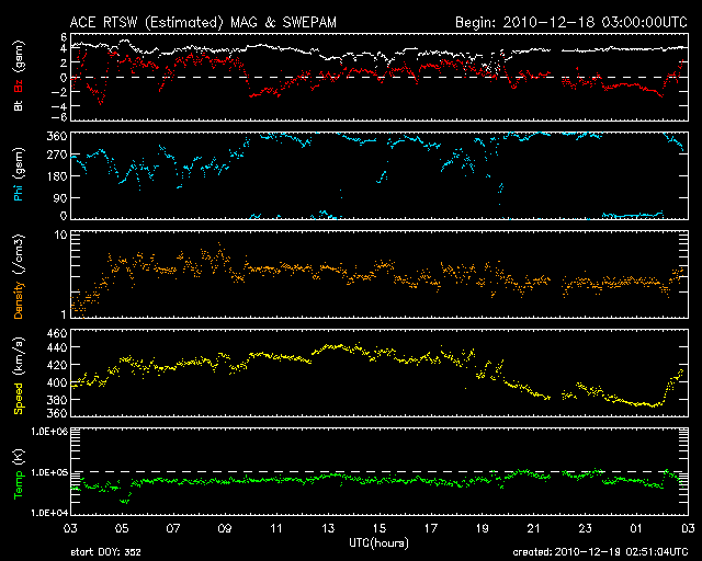 2010/12/17 11:47 太陽風の速度は下がり始め、450km/秒とやや高速くらいです。