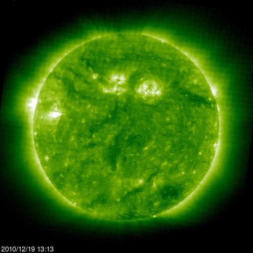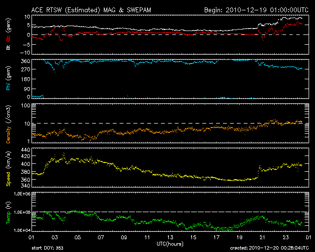 2010/12/20 09:29 更新 太陽風の速度が400km/秒に上がっています。太陽は無黒点です。 担当 篠原 今朝、20日6時(世界時19日21時)頃から、太陽風に変化が発生しています。 磁場強度が3nTから9nTへ強まり、 速度も360km/秒から400km/秒へ小幅の上昇をしています。 SOHO EIT195の太陽コロナを見ると、 特に影響を及ぼしそうなコロナホールは見当たらず、 太陽風の変化は小規模で終わるのではないかと思われます。 また、目立ったコロナホールが見られないことから、 この後も、1週間から2週間近くにわたって、穏やかな状態が続くかもしれません。 現在の磁気圏は静穏です。 AE指数は全く変化していません。 太陽の活動も静かです。 今日も無黒点のままで、X線のグラフもほとんど変化していません。 ところで、今朝はアメリカの太陽望遠鏡のサイトが妙です。 SDOは、昨日の昼、19日13時(世界時19日4時)、 STEREOは、一昨日の昼、18日12時(世界時18日3時)のデータを最後に、 両者更新が止まっています。 最近は、SOHOよりも更新頻度の高いこれらの衛星に頼って分析しているのですが、 結果的に現在はSOHOの写真が最新となっています。 週末でどこかの処理が止まっているのでしょうか? SOHO衛星のEIT195カメラによる太陽コロナの様子 (c) SOHO (ESA & NASA) ![]() SOHO衛星による太陽の可視光写真。マウスの矢印を写真に重ねると、黒点番号付きの写真に切り替わります。 (c) SOHO (ESA & NASA) ![]() ACEが観測した太陽風の磁場(1番上の枠、白線は全体の強度、赤線は南北成分) および、太陽風の密度(3番目の橙線)、速度(4番目の黄線) (c) NOAA/SWPC ![]() リアルタイムAE指数 下段のAEグラフの値が高くなると、オーロラ活動が活発化しています。 (c) 京都大学, NICT ![]() 27日の太陽周期に合わせたデータプロット 太陽が同じ面を地球に向けていた27日前の変化から、今後を予想することができます。 (c) 作図:宇宙天気ニュース