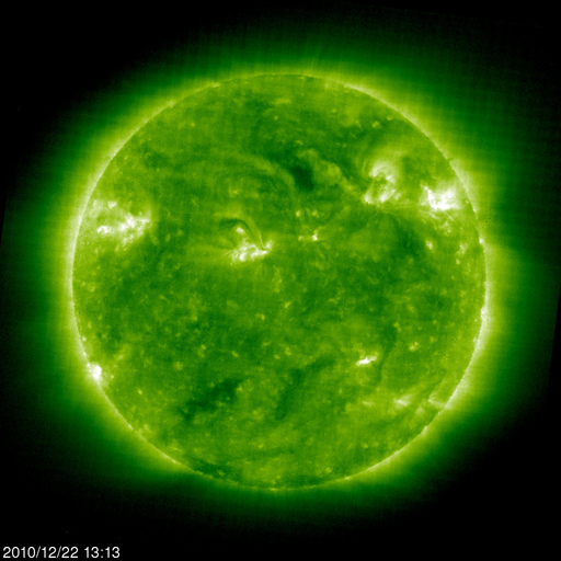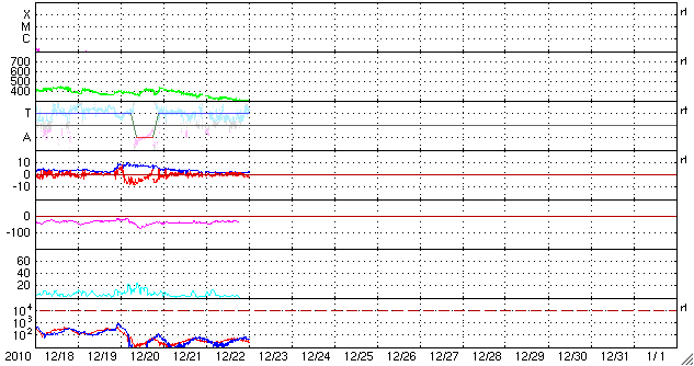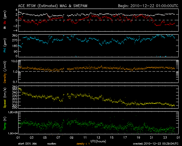 2010/12/23 09:30 更新 太陽風は速度300km/秒へ下がりました。太陽も静穏です。 担当 篠原 太陽風は、更に速度が下がり、 300km/秒とかなり低速の風になっています。 磁場強度も弱く、2nTで安定しています。 磁気圏も静かです。 AE指数は、全く変化していません。 27日周期の図によると、前周期は11月27〜28日に小規模の速度上昇が発生しました。 太陽の北半球側、もしくは南半球側の小規模のコロナホールの影響と思われます。 これらのコロナホールは、今日のSOHO EIT195でも見えていますが、 どちらも規模はより小さくなっています。 このため、地球へ及ぶ影響もより小さくなっている可能性があり、 その場合、穏やかな太陽風がこのまま当分続くことになるでしょう。 太陽は、今度は南西(右下)側に、極く小さな黒点らしき点が見えています。 磁場の強まりも発生しているので、黒点だと思われます。 NOAA/SWPCの報告には特に記載はなく、番号も付けられていません。 フレア活動も全くなく、静かな太陽です。 SDOのデータは、更新が止まったままです。 地上のデータ処理システムに障害が発生したそうで、修理を待てとのことです。 衛星側の問題ではなく、一安心です。 SOHO衛星のEIT195カメラによる太陽コロナの様子 (c) SOHO (ESA & NASA) ![]() SOHO衛星による太陽の可視光写真。マウスの矢印を写真に重ねると、黒点番号付きの写真に切り替わります。 (c) SOHO (ESA & NASA) ![]() ACEが観測した太陽風の磁場(1番上の枠、白線は全体の強度、赤線は南北成分) および、太陽風の密度(3番目の橙線)、速度(4番目の黄線) (c) NOAA/SWPC ![]() リアルタイムAE指数 下段のAEグラフの値が高くなると、オーロラ活動が活発化しています。 (c) 京都大学, NICT ![]() 27日の太陽周期に合わせたデータプロット 太陽が同じ面を地球に向けていた27日前の変化から、今後を予想することができます。 (c) 作図:宇宙天気ニュース