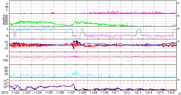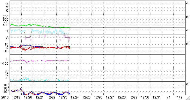 2010/12/21 11:43 太陽風磁場が安定した南向きになりました。16日のフィラメント噴出の影響かもしれません。