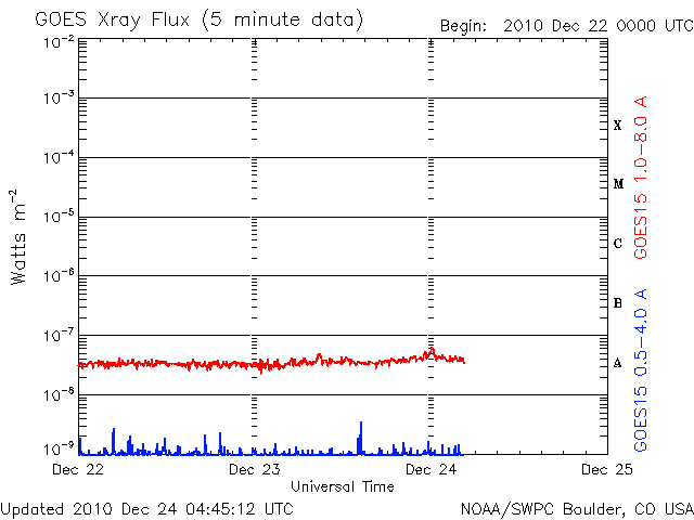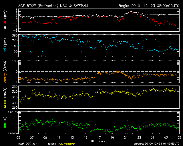 2010/12/23 09:30 太陽風は速度300km/秒へ下がりました。太陽も静穏です。