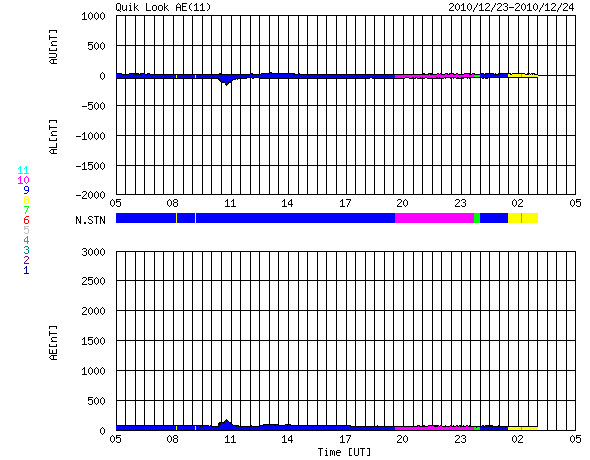 下段のAEグラフの値が高くなると、オーロラ活動が活発化しています。