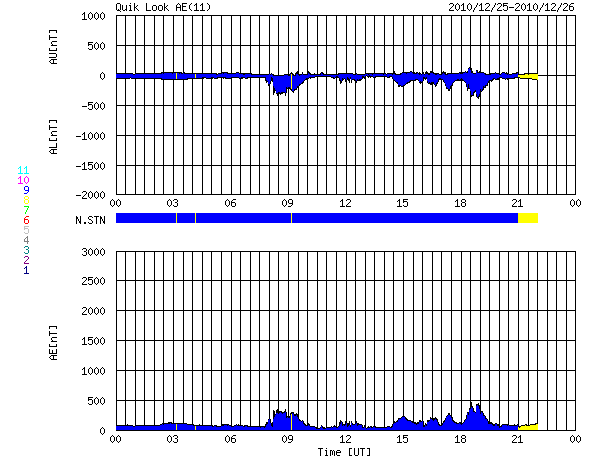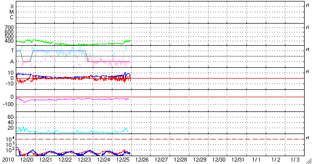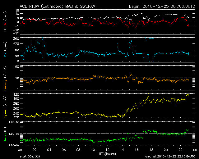 2010/12/26 08:12 更新 太陽風は平均的な速度に上がっています。小さなコロナホールの影響と思われます。 担当 篠原 26日に入った頃から(世界時25日15時)、太陽風の速度が上昇を始め、 330km/秒の低速風から、400km/秒の平均的な速度を回復しています。 小さなコロナホールの影響がやって来た様です。 27日周期の図で比較すると、前周期よりも1日遅れの開始です。 磁場強度も、初めに10nTに強まり、 速度が高まった後はやや下がりましたが、現在も8nTほどに強まったままです。 このため、もう一段速度が高まる可能性もあります。 オーロラの活動度を示すAE指数は、200〜400nTの小規模の変化を示しています。 速度の上昇が小規模なので、この程度の活動になっているのでしょう。 今回の速度変化は、タイミングから考えると 北半球側に見えていた小さなコロナホールの影響の可能性があります。 これに続いて、南半球側のコロナホールの影響がやって来る場合、 太陽風の速度変動は明日以降もうしばらく続くかもしれません。 太陽は、昨日書いたように、SOHO、SDO、STEREOのいずれも更新停止、 もしくはアクセス不能になっています。 従って、今日は掲載する写真がありません。 NOAA/SWPCの報告によると、 南西に1136黒点群、北東に1137黒点群が発生したそうです。 しかし、GOESのX線のグラフには特に変化はなく、 新しい黒点群の活動度は低いようです。 最悪の場合、年が明けるまでメンテナンスが行われず、 更新停止の状態が続くのでしょうか。 ACEが観測した太陽風の磁場(1番上の枠、白線は全体の強度、赤線は南北成分) および、太陽風の密度(3番目の橙線)、速度(4番目の黄線) (c) NOAA/SWPC ![]() リアルタイムAE指数 下段のAEグラフの値が高くなると、オーロラ活動が活発化しています。 (c) 京都大学, NICT ![]() 27日の太陽周期に合わせたデータプロット 太陽が同じ面を地球に向けていた27日前の変化から、今後を予想することができます。 (c) 作図:宇宙天気ニュース