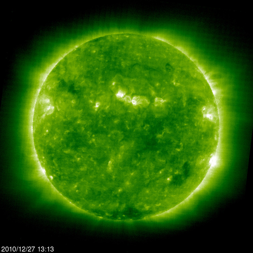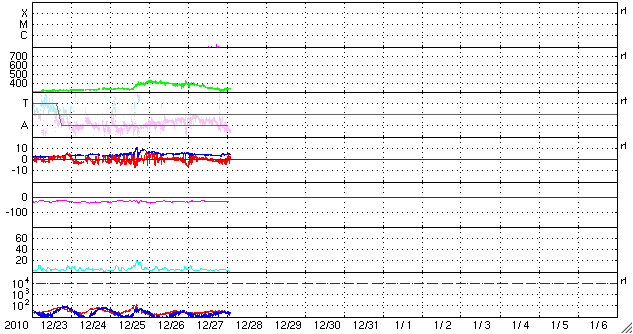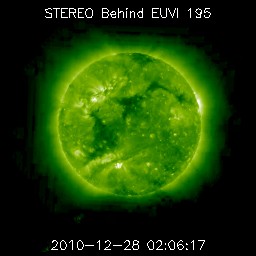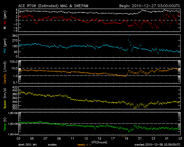 2010/12/28 11:56 更新 太陽風の速度は340km/秒に下がり、低速状態です。SOHOの写真が更新されています。 担当 篠原 穏やかな宇宙天気が続いています。 太陽風の速度はもう一段低下し、昨夜のうちに340km/秒まで下がりました。 磁気圏も静穏で、AE指数はほとんど変化していません。 ACEのグラフの後半で、密度(橙色線)が少し増加し、 磁場強度がほんの少しですが、4nTから5nTヘ増えています。 もしかすると、南半球の小さなコロナホールの影響が、 遅れ気味にやって来るのかもしれません。 その場合も、速度の変化は小幅に留まるでしょう。 SOHO EIT195の太陽コロナ写真が更新されています。 特にコロナホールなどは見られず、穏やかな太陽風がしばらく続きそうです。 昨日も紹介した、STEREO Behindの細長いコロナホールは(今日1枚目の写真)、 このSOHOの写真でも、左端にかすかに見えています。 もう少し中央に回ってくると目立つようになるでしょう。 太陽には、中央の北半球側に黒点が見えています。 1138黒点群だとのことです。 昨日までの1137黒点群は、このすぐ左上にありました。 EIT195では、明るい光が残っています。 X線グラフでは、B1にやっと届く程度の小さな変化が発生しています。 新しく現れた1138黒点群が起こしています。 現時点では規模は小さく、今後更に発達するかどうかです。 STEREO Behind EUVI195による、東側の太陽コロナ。 (c) STEREO (NASA) ![]() SOHO衛星のEIT195カメラによる太陽コロナの様子 (c) SOHO (ESA & NASA) ![]() SOHO衛星による太陽の可視光写真。マウスの矢印を写真に重ねると、黒点番号付きの写真に切り替わります。 (c) SOHO (ESA & NASA) ![]() ACEが観測した太陽風の磁場(1番上の枠、白線は全体の強度、赤線は南北成分) および、太陽風の密度(3番目の橙線)、速度(4番目の黄線) (c) NOAA/SWPC ![]() リアルタイムAE指数 下段のAEグラフの値が高くなると、オーロラ活動が活発化しています。 (c) 京都大学, NICT ![]() 27日の太陽周期に合わせたデータプロット 太陽が同じ面を地球に向けていた27日前の変化から、今後を予想することができます。 (c) 作図:宇宙天気ニュース