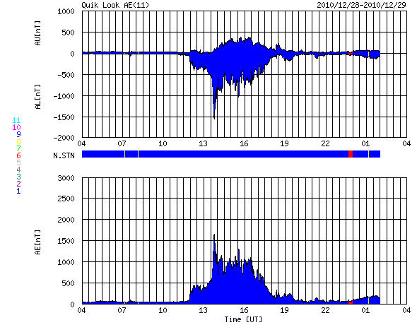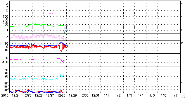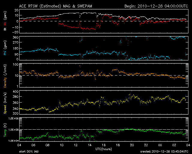 2010/12/29 12:46 更新 太陽風磁場が大きく南を向き、オーロラ活動が激しくなりました。 担当 篠原 太陽風の磁場に、大きな乱れが発生しました。 昨日の夕方から、太陽風の磁場強度はゆっくりと強まり、 10nTを超えて、28日20時(世界時28日11時)頃には、15nT近くにまで達しました。 磁場の南北成分は、変化の初めは比較的弱めで、北向きに推移していました。 このため、磁気圏への影響も弱かったのですが、 28日18時半(世界時28日9時半)に一転して-5nTと南向きにはっきりと振れ、 その後、6時間にわたって、最大で-13nTとなる強い南向き磁場となりました。 太陽風の速度は350km/秒と低速状態だったのですが、 南向き磁場の影響で磁気圏は激しく乱れ、 AE指数は、最大1600nT、3時間にわたって1000nTの変動が続く かなり活発な変化をしました。 NOAA/SWPCの報告では、 23日に発生したCME(12月24日の記事を参照)が原因ではないかと書いています。 到来まで5日ほどかかっていますが、 350km/秒の低速風に運ばれたのであれば、そのくらいの見積もりになります。 現在の太陽風は、磁場強度は3nTほどに下がり、 速度は少し上がっていますが、370km/秒とやや低速の状態です。 磁場の乱れは終わり、この後は穏やかな太陽風が続くでしょう。 太陽では、1138黒点群が少し大きくなっています。 磁場の構造が複雑化している様ですが、 X線のグラフに変化はなく、活動は穏やかなままです。 引き続き、黒点群の変化に注目してください。 SOHO衛星のEIT195カメラによる太陽コロナの様子 (c) SOHO (ESA & NASA) ![]() SOHO衛星による太陽の可視光写真。マウスの矢印を写真に重ねると、黒点番号付きの写真に切り替わります。 (c) SOHO (ESA & NASA) ![]() ACEが観測した太陽風の磁場(1番上の枠、白線は全体の強度、赤線は南北成分) および、太陽風の密度(3番目の橙線)、速度(4番目の黄線) (c) NOAA/SWPC ![]() リアルタイムAE指数 下段のAEグラフの値が高くなると、オーロラ活動が活発化しています。 (c) 京都大学, NICT ![]() 27日の太陽周期に合わせたデータプロット 太陽が同じ面を地球に向けていた27日前の変化から、今後を予想することができます。 (c) 作図:宇宙天気ニュース