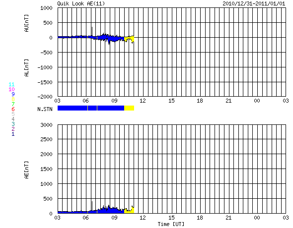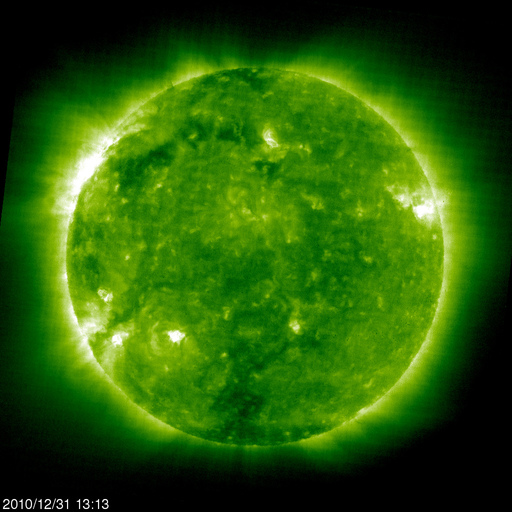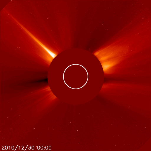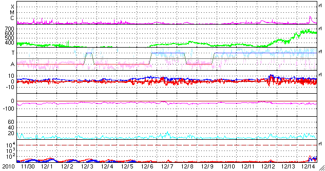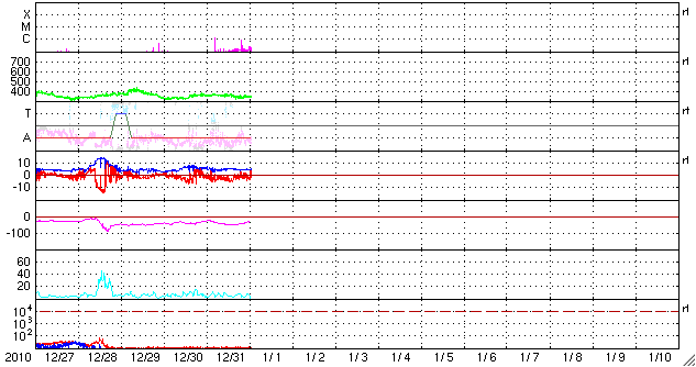 2011/ 1/ 1 11:27 更新 太陽に4つの黒点群が現れてにぎわっています。太陽風は低速風が続いています。 担当 篠原 あけましておめでとうございます。 2011年も宇宙天気ニュースをよろしくお願いします。 新年を記念して、過去記事の閲覧ページを作成しました。 これまでリストから探さねばならなかった過去記事でしたが、 日付指定で探したり、前後にたどって行くこともできるようになりました。 ページ上部の「過去のニュースの 閲覧・全リスト」にリンクを置いています。 どうぞご利用ください。 新年を迎えて、太陽に黒点が急に現れています。 昨日の写真では、黒点はほとんど見えなかったのですが、 今日は、北半球に2つ、南半球に2つそれぞれ黒点群が出現しています。 南半球の中央寄りの黒点は、一旦消えていた1139黒点群です。 そして、北半球東端に現れた黒点は1140黒点群と番号が付けられ、 残りの2つは、まだNOAAの番号はついていません。 黒点は見えなくなっていますが、北半球西端の1138黒点群の場所で、 31日13時(世界時31日4時)にC1の小規模フレアが発生しています。 このフレアに続いて、弱いCME(太陽ガスの放出現象)も発生しています。 地球からはだいぶ横向きなので、影響はないでしょう。 昨日のニュースで紹介した、2つのCMEと合わせて、 SOHO LASCO C2による動画を掲載します。 右に左にと、次々にCMEが飛び出して行きます。 太陽風は、低速の穏やかな風が続いています。 速度は360km/秒からやや下がって340km/秒。 磁場強度は5nTでほぼ安定しています。 南北成分は、振幅は弱いですが、南寄りの傾向が続いています。 掲載のAE指数のグラフは、前半でデータが停止していますが、 京都大学WDCを参照すると、 300nTから瞬間的に500nTに及ぶ小規模の活動が続いていた様です。 このグラフから北極域のオーロラの様子は直接は分かりませんが、 2010年最後のオーロラの輝きが見られたのではないでしょうか。 今日のSOHO EIT195を見ると、 北半球の細長いコロナホールは、少しずつ西側(右側)へ進行しています。 幅が細いことや、緯度が高めであることから、 地球への影響は、やって来てもかなり限定的となりそうですが、 明後日の1月3日以降の太陽風に影響が見られるかもしれません。 その後、大きく広がったコロナホールがこちら側へ回って来ますが、 EIT195の写真では、東端にかすかに見えて来ています。 こちらの影響は6日程度先になるでしょう。 SOHO LASCO C2によるCMEの観測。右に左にと次々噴出しています。 (c) SOHO (ESA & NASA)、動画加工 : 宇宙天気ニュース ![]() GOES衛星の太陽X線データ (c) NOAA/SWPC ![]() SOHO衛星のEIT195カメラによる太陽コロナの様子 (c) SOHO (ESA & NASA) ![]() SOHO衛星による太陽の可視光写真。マウスの矢印を写真に重ねると、黒点番号付きの写真に切り替わります。 (c) SOHO (ESA & NASA) ![]() ACEが観測した太陽風の磁場(1番上の枠、白線は全体の強度、赤線は南北成分) および、太陽風の密度(3番目の橙線)、速度(4番目の黄線) (c) NOAA/SWPC ![]() リアルタイムAE指数 下段のAEグラフの値が高くなると、オーロラ活動が活発化しています。 (c) 京都大学, NICT ![]() 27日の太陽周期に合わせたデータプロット 太陽が同じ面を地球に向けていた27日前の変化から、今後を予想することができます。 (c) 作図:宇宙天気ニュース