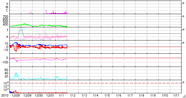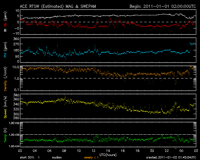 2011/ 1/ 2 10:46 更新 太陽風の速度は下がり低速です。太陽も、黒点は多いものの活動は穏やかです。 担当 篠原 概ね穏やかな年明けとなっています。 太陽風の速度は、350km/秒から330km/秒へ低下し、一段と低速風になっています。 磁場強度は、5nT前後と平均的な強さを保っていますが、 南北成分は-3nTと南側に偏った状態が続いています。 このため、昨日同様にAE指数で300nTほどの小規模の磁気圏活動が発生しています。 (京大WDCのページを参照) この変化が単純にオーロラの活動を示すわけではありませんが、 北極域では新年のオーロラがある程度見られたのではないでしょうか。 掲載のSOHO EIT195は、昨日の昼頃の写真です。 北半球の中緯度域に細長いコロナホールが見えていたのですが、 北半球の中央部に発生した1141黒点群の強まりを受けて、 コロナホールは見えにくくなっています。 この変化が、今後地球へやって来る太陽風にどの様に影響するでしょうか。 この辺りのコロナホールの影響は、早ければ明日くらいから現れそうです。 一方、太陽の東側からは、北半球から南半球にかけて大きく広がっている コロナホールの姿が次第に見えて来ました。 明日くらいにこの大きな領域の先頭部分が太陽の中心線に達しそうです。 すると、早ければ6日くらいから太陽風に影響がやって来るかもしれません。 本格的な速度の上昇は1日程度遅れると思われますが、 以降は活発なオーロラ活動なども期待できます。 太陽は、黒点たちがにぎやかに姿を見せています。 北半球の中央西寄り(右寄り)に見える黒点は、1141黒点群。 南半球の東寄り(左寄り)の黒点は、1142黒点群と番号が付けられています。 どちらの黒点群も、昨日の写真よりも黒点の数が増加しています。 一方、X線のグラフにはBクラスの小さなフレアが数回発生していますが、 これらは、北半球の東端に見える1140黒点群が起こしている様です。 黒点群としては特に発達は見られず、活動が強まることはなさそうです。 昨日もお知らせしましたが、念願だった過去記事の閲覧ページができあがりました。 日付指定で探したり、前後にたどって行くこともできます。 ページ上部の「過去のニュースの 閲覧・全リスト」にリンクを置いています。 どうぞご利用ください。 SOHO衛星のEIT195カメラによる太陽コロナの様子 (c) SOHO (ESA & NASA) ![]() SOHO衛星による太陽の可視光写真。マウスの矢印を写真に重ねると、黒点番号付きの写真に切り替わります。 (c) SOHO (ESA & NASA) ![]() ACEが観測した太陽風の磁場(1番上の枠、白線は全体の強度、赤線は南北成分) および、太陽風の密度(3番目の橙線)、速度(4番目の黄線) (c) NOAA/SWPC ![]() 27日の太陽周期に合わせたデータプロット 太陽が同じ面を地球に向けていた27日前の変化から、今後を予想することができます。 (c) 作図:宇宙天気ニュース