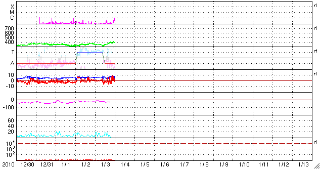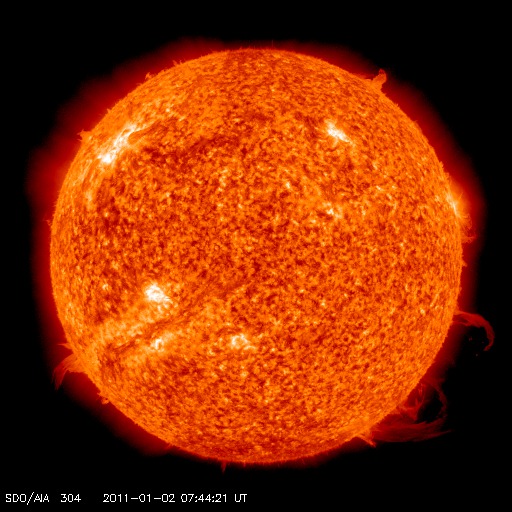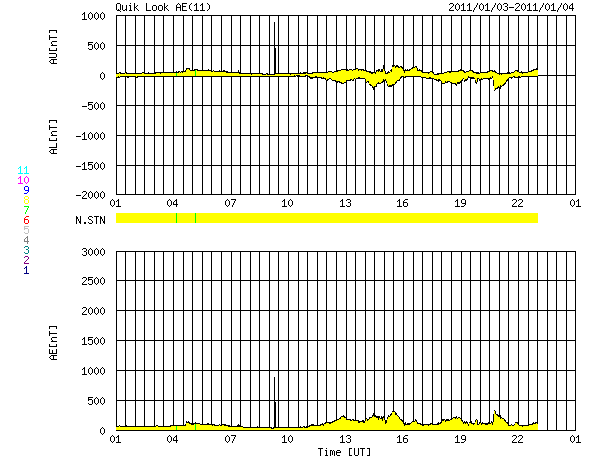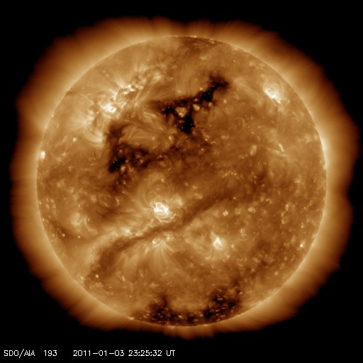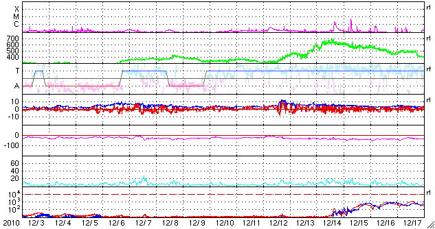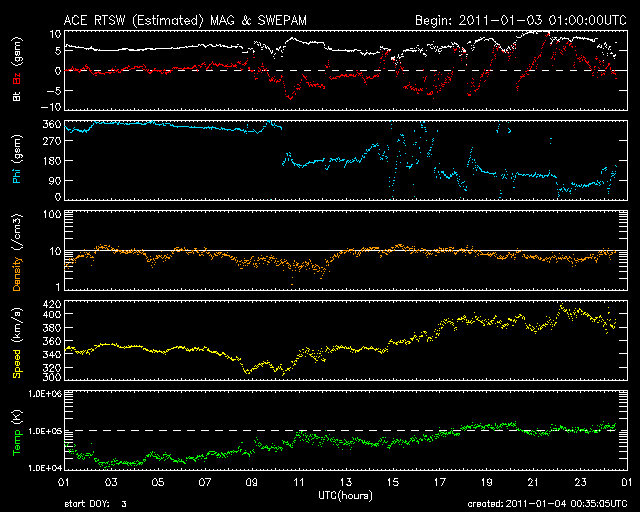 2011/ 1/ 4 09:32 更新 太陽風の速度がやや上がり、小規模のオーロラも発生しています。 担当 篠原 SDO衛星のデータ更新が復活しました。 SDOのページから警告の赤い帯が消え、最新の写真や動画が見られる様になっています。 SOHOに比べると時間分解能がとても細かいので、復活は非常にうれしいです。 ただ、左にリンクを設けているAIA193やAIA304の動画ページを開くと、 写真の時間間隔の問題なのか、コマ送りの速度の問題なのか、 故障前と比べると動画の進みが慌ただしくなった気がします。 (現象の発生時刻がほとんど読み取れません・・・) 復活を記念して、1月2日の撮影ですがAIA304の派手な画像と、 AIA193による現在の太陽コロナの写真を掲載します。 これによると、太陽の北半球の中央部から東寄り(左寄り)の赤道域にかけて、 大きなコロナホールが2つに分かれて広がっています。 右側の広い部分は、ちょうど太陽の中心線に来ています。 3日後の7日頃には速度の高い太陽風がやって来ているでしょう。 コロナホールの最後尾(左端)まで考えると、 今から1週間後くらいまでは、高速風が続くと思われます。 現在の太陽風は、昨夜より速度がやや上昇し、 400km/秒近くと平均的な速度に戻っています。 同時に、磁場の傾向も南寄りに切り替わり、 再び磁気圏に小規模のオーロラ活動を作っています。 AE指数は、200〜300nTくらいですが、変動を続けています。 この変化が、細長く見えていたコロナホールの影響なのかどうか、 はっきりとは分かりませんが、引き続き速度が高めで推移する可能性もあります。 また、明後日くらいになれば、 今日のAIA193で大きく見えているコロナホールの影響も始まります。 今後は、オーロラの活動にも注目です。 太陽では、C1に達する小規模フレアがつい先ほど発生した様です。 発生地点は分かりませんが、その前にもBクラスの変動が数回発生しています。 これらは、太陽の西端近くに見えている1141黒点群で発生しています。 このため、C1のフレアもここで起きている可能性が高いでしょう。 1141黒点群は黒点としては特に発達している様子はなく、 現時点では、更に活動が激しくなるということはなさそうです。 SDO AIA304による、プロミネンスの様子。 (c) SDO (NASA) ![]() SDO衛星のAIA193カメラによる太陽コロナの様子 (c) SDO (NASA) ![]() SOHO衛星による太陽の可視光写真。マウスの矢印を写真に重ねると、黒点番号付きの写真に切り替わります。 (c) SOHO (ESA & NASA) ![]() ACEが観測した太陽風の磁場(1番上の枠、白線は全体の強度、赤線は南北成分) および、太陽風の密度(3番目の橙線)、速度(4番目の黄線) (c) NOAA/SWPC ![]() リアルタイムAE指数 下段のAEグラフの値が高くなると、オーロラ活動が活発化しています。 (c) 京都大学, NICT ![]() 27日の太陽周期に合わせたデータプロット 太陽が同じ面を地球に向けていた27日前の変化から、今後を予想することができます。 (c) 作図:宇宙天気ニュース