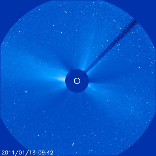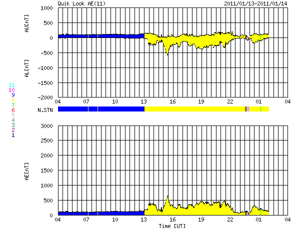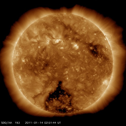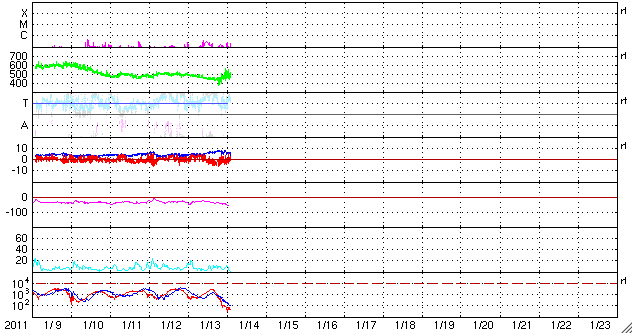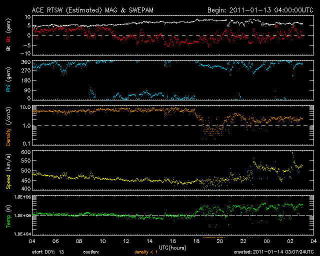 2011/ 1/14 12:07 更新 太陽風の速度が550km/秒に上昇しています。C1のフレアが発生しています。 担当 篠原 今朝より太陽風の速度は500km/秒台に上昇し、現在は550km/秒付近に達しています。 コロナホールの影響が及び始めたようです。 昨日のニュース以降、太陽風の速度は450km/秒で落ち着いていました。 一方、夜に入った頃から磁場強度が5nTを超えて、 今日の早朝に8nT程度まで高まりました。 振幅は小さかったのですが、その後の速度上昇に先行する変動だったようです。 速度が上がり始めるとともに、磁場強度は5nT近くへ下がっています。 この間、半日にわたって、太陽風磁場の南北成分は-2〜-3nTと振幅は小さいですが、 南向きの状態が続きました。 この影響で、AE指数500nT弱の小規模のオーロラ活動が長時間発生しています。 半月の月明かりの下ですが、きれいなオーロラが見えていたのではないでしょうか。 現在は、南北成分は0nTを挟んだ変化に変わり、 オーロラの変動も一休みとなっています。 太陽風には、コロナホールの影響が及び始めたと考えられますが、 規模から見ると、高い速度は2〜3日程度で終わるのではないでしょうか。 その後は、SDO AIA193で南極から伸びているコロナホールの影響が、 地球までどの程度やって来るかになりそうです。 南側に緯度が高いため、大きな影響は来にくいのですが、 これだけ広いとある程度の変化はやって来るかもしれません。 3日後に注目です。 太陽では、今日は東に向かって大きなCME(太陽ガスの放出現象)が発生しています。 東端の向こう側で発生したフレアによるものです 地球への影響はありません。 また、最新のX線データによると、ちょうど今、C1を超えるフレアが発生しています。 現在こちら側の太陽面には目立った黒点はなく、 このフレアはどこで発生したのでしょうか。 SOHO LASCO C3による、東方向へのCMEの噴出。 (c) SOHO (ESA & NASA)、動画加工 : 宇宙天気ニュース ![]() SDO衛星のAIA193カメラによる太陽コロナの様子 (c) SDO (NASA) ![]() SDO衛星による太陽の可視光写真 (c) SDO (NASA) ![]() ACEが観測した太陽風の磁場(1番上の枠、白線は全体の強度、赤線は南北成分) および、太陽風の密度(3番目の橙線)、速度(4番目の黄線) (c) NOAA/SWPC ![]() リアルタイムAE指数 下段のAEグラフの値が高くなると、オーロラ活動が活発化しています。 (c) 京都大学, NICT ![]() 27日の太陽周期に合わせたデータプロット 太陽が同じ面を地球に向けていた27日前の変化から、今後を予想することができます。 (c) 作図:宇宙天気ニュース