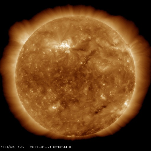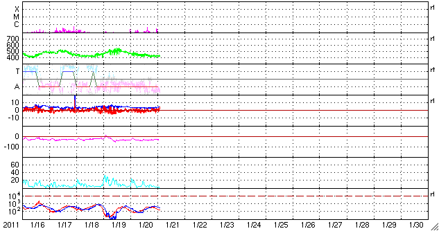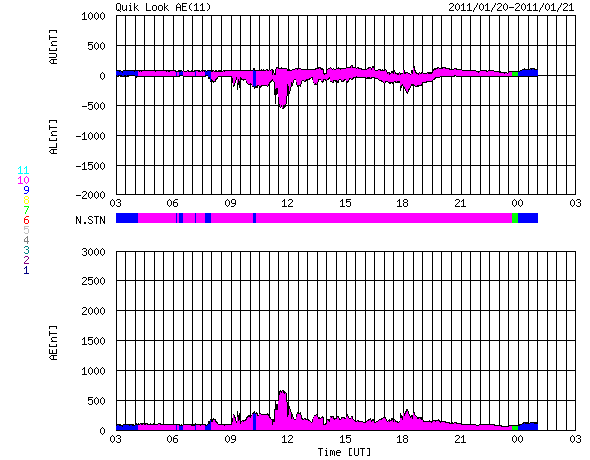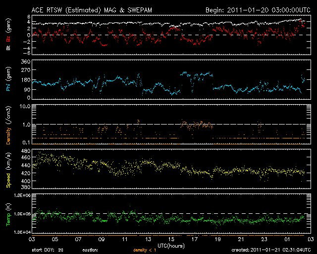2011/ 1/21 11:31 更新 太陽風は平均的な速度に下がっています。これから低速の太陽風が続きそうです。 担当 篠原 太陽風の速度は、420km/秒と平均的な状態に戻り、 そこで安定しています。 磁場強度は、3〜4nTとやや弱めです。 高速風の続く領域を抜け出し、静かな太陽風に変わりつつあるようです。 太陽風磁場の南北成分は、振れ幅は小さいものの南寄りの傾向が続き、 磁気圏では、小さな規模のオーロラ活動が発生していました。 しかし、月が満月付近なので、観望には厳しそうです。 27日周期の図で、前周期の太陽風を見ると、 1月3日までずっと速度が低く、穏やかです。 このときは、1月6日まで低速風は続きました。 この様子を参考にすると、これから10日以上は静かな太陽風、磁気圏となりそうです。 太陽コロナの写真にも、コロナホールは見られません。 太陽は、1148黒点群が西の端に近付き、 1147黒点群が北側の中心付近に目立つだけです。 X線ではBクラスの小さな変動が発生していますが、 これ以上特に大きくなることはなさそうです。 SDO衛星のAIA193カメラによる太陽コロナの様子 (c) SDO (NASA) ![]() SDO衛星による太陽の可視光写真 (c) SDO (NASA) ![]() ACEが観測した太陽風の磁場(1番上の枠、白線は全体の強度、赤線は南北成分) および、太陽風の密度(3番目の橙線)、速度(4番目の黄線) (c) NOAA/SWPC ![]() リアルタイムAE指数 下段のAEグラフの値が高くなると、オーロラ活動が活発化しています。 (c) 京都大学, NICT ![]() 27日の太陽周期に合わせたデータプロット 太陽が同じ面を地球に向けていた27日前の変化から、今後を予想することができます。 (c) 作図:宇宙天気ニュース