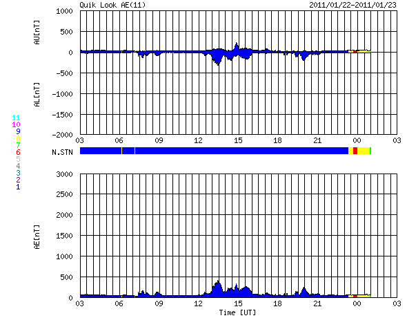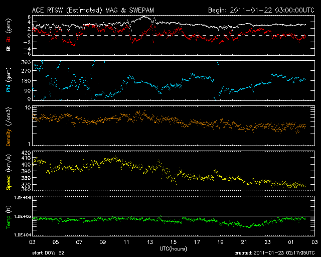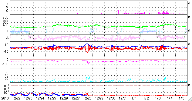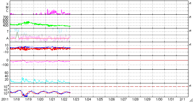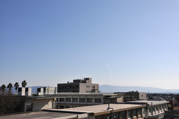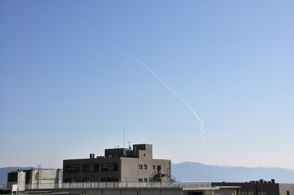 2011/ 1/23 11:18 更新 1149黒点群が発達しています。H2Bの打ち上げの様子を紹介します。 担当 篠原 昨日、こうのとり2号機を積んだH2Bロケットが種子島から打ち上げられました。 ロケットの打ち上げというと、テレビのニュースなどでは、 発射台から大きなロケットが炎を上げて上昇していく姿を見ることになります。 私もこれまではそういう映像にしか縁がありませんでした。 ところが、鹿児島県に住むと、 地平線の向こうから大空に向かって 小さなロケットが飛び上がっていく様子が普通に見えるのです。 九州の南半分に住んでいる方には昔からの常識なのでしょうが、 他所者にとってはものすごい驚きでした。 昨日は、校舎の屋上からじっくりと打ち上がっていく様子を観望しました。 写真を2枚掲載します。 飛行機雲のできそこないみたいな雲の筋がロケットの跡です。 やや引いた写真なので分かりにくいですが、 学校の景色と見比べると、実際の見え具合を感じていただけるのではないでしょうか。 上昇のところでは、炎を吹き出している様子もしっかり見ることができました。 次回は、望遠鏡など用意してじっくり追跡してみたいです。 普通、ロケットの打ち上げを見に行くなら、現地へ出かけますから、 こんな中途半端な場所から見上げることができるのは意外に貴重な事のように感じます。 1149黒点群は、変化を続けています。 その様子をSDO衛星による動画で紹介します。 昨日は、22日17時(世界時22日8時)に、C2.4の小規模フレアを起こしています。 しかし、その他には目立った活動はなく、 黒点としては大きくなっていますが、活動度は下がった様です。 しかし、一休みして、再び活発化するという変化はよく見られることですので、 引き続き、1149黒点群の活動には注意が必要です。 太陽風は、ゆっくりと速度の低下が進み、 370km/秒と低速風に変わりつつあります。 磁場強度も3nTに下がりました。 磁気圏も静穏で、AE指数は小さな変動が見られる程度です。 太陽にはコロナホールも見られず、 今後は、低速の太陽風が長く続くと思われます。 掲載している27日周期の図では、前周期の太陽風もずっと低速です。 H2Bロケットの打ち上げを、鹿児島県霧島市から眺めた様子です。 (c) 宇宙天気ニュース ![]() 少し拡大。ロケットの噴煙が青空を切り裂いて上ります。 (c) 宇宙天気ニュース ![]() SDOの可視光写真による、1149黒点群の変化。 (c) SDO (NASA)、動画加工 : 宇宙天気ニュース ![]() SDO衛星のAIA193カメラによる太陽コロナの様子 (c) SDO (NASA) ![]() SDO衛星による太陽の可視光写真 (c) SDO (NASA) ![]() GOES衛星の太陽X線データ (c) NOAA/SWPC ![]() ACEが観測した太陽風の磁場(1番上の枠、白線は全体の強度、赤線は南北成分) および、太陽風の密度(3番目の橙線)、速度(4番目の黄線) (c) NOAA/SWPC ![]() リアルタイムAE指数 下段のAEグラフの値が高くなると、オーロラ活動が活発化しています。 (c) 京都大学, NICT ![]() 27日の太陽周期に合わせたデータプロット 太陽が同じ面を地球に向けていた27日前の変化から、今後を予想することができます。 (c) 作図:宇宙天気ニュース