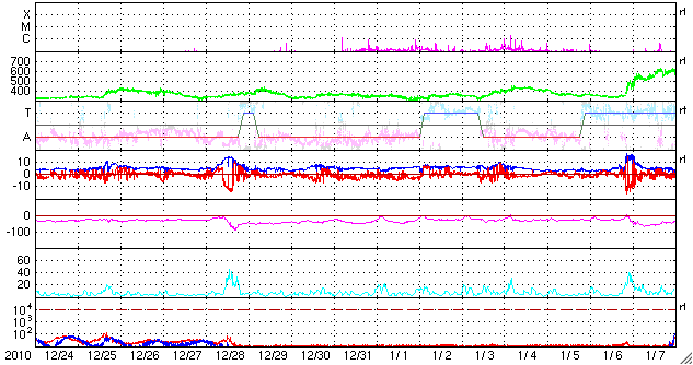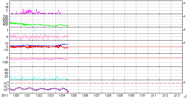 SDO衛星のAIA193カメラによる太陽コロナの様子 (c) SDO (NASA) ![]() SDO衛星による太陽の可視光写真 (c) SDO (NASA) ![]() GOES衛星の太陽X線データ (c) NOAA/SWPC ![]() ACEが観測した太陽風の磁場(1番上の枠、白線は全体の強度、赤線は南北成分) および、太陽風の密度(3番目の橙線)、速度(4番目の黄線) (c) NOAA/SWPC ![]() リアルタイムAE指数 下段のAEグラフの値が高くなると、オーロラ活動が活発化しています。 (c) 京都大学, NICT ![]() 27日の太陽周期に合わせたデータプロット 太陽が同じ面を地球に向けていた27日前の変化から、今後を予想することができます。 (c) 作図:宇宙天気ニュース