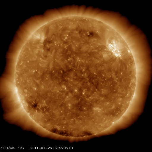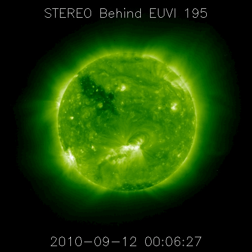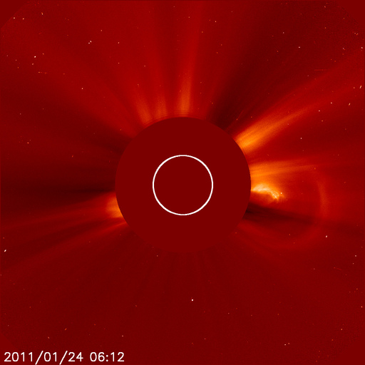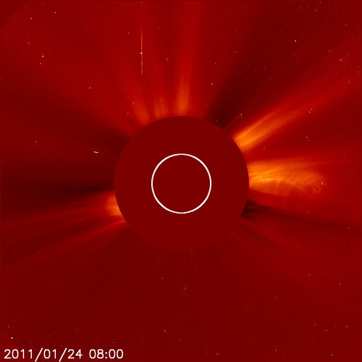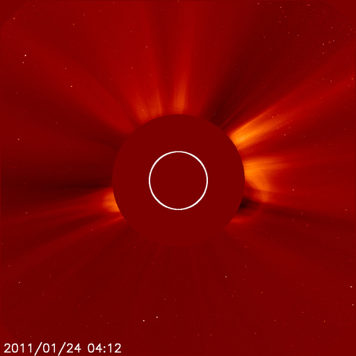 2011/ 1/25 12:15 更新 1149黒点群はC1フレアを起こしています。太陽風は低速です。 担当 篠原 1149黒点群は、昨日、24日15時(世界時24日6時)に、 C1.4の小規模フレアを起こしました。 しかし、目立った活動はこれひとつで、 活動度は特に上がることもなく推移しています。 黒点の見え方も、特に変化はありません。 1149黒点群は次第に西の端に近付いていて、 このまま没していくことになりそうです。 一方、太陽の南西部でフィラメントの噴出が発生しました。 その影響で、CME(太陽ガスの放出現象)がSOHOのLASCOカメラで撮影されています。 それほど濃い噴出ではなく、淡く写っている程度です。 横方向なので、地球への影響はありません。 太陽風は、一時的に400km/秒に上がる変化が発生しましたが、 速度360km/秒と低速の状態が続いています。 一方、磁場強度は5nTを超えて、8nTくらいに強まる変化をしています。 それに伴って、南北成分が南向き-3nTほどで半日ほど安定しています。 AE指数を見ると、その影響が小規模ですが見られ、 200〜400nTほどの変化が続いています。 この後も、太陽風は低速の状態が続くと思われます。 SDOの太陽コロナ写真には、コロナホールは見られず、 1149黒点群の付近以外はのっぺりとしています。 一方、STEREO Behindで少し先回りをすると、 昨日紹介したように、太陽には大きなコロナホールが、 北極から中央部の赤道付近まで広がっています。 昨年の9月から今月までのコロナホールの変化を動画にします。 27日ごとに重ねることで、ほぼ同じ場所を眺め続けることができます。 すると、コロナホールの広がりが、半年の間にどんどん動いています。 太陽の活動周期の中で、 内部の磁場分布が大きく変化する時期を迎えているのでしょう。 ダイナミックで興味深いですが、太陽風の予想には辛い季節です。 STEREO Behind EUVI195による、2010年9月から2011年1月までの太陽コロナの変化。 (c) STEREO (NASA) ![]() SOHO衛星 LASCO C2カメラの映像 (c) SOHO (ESA & NASA)