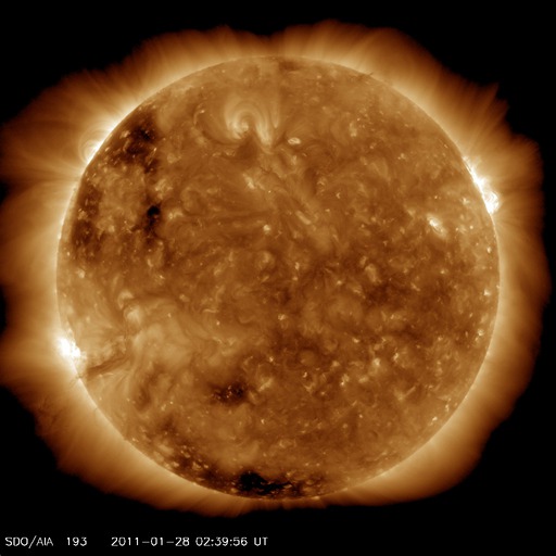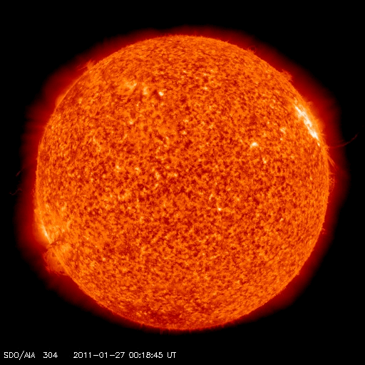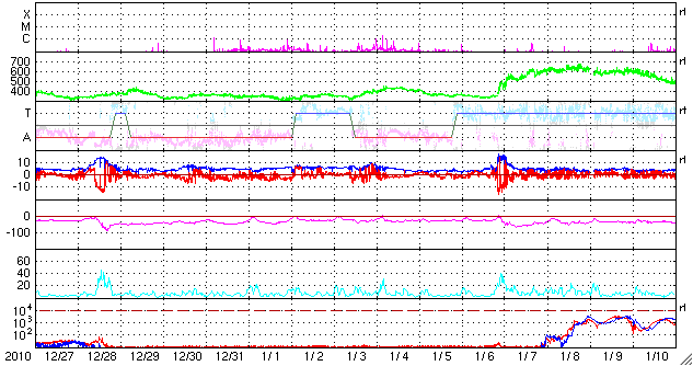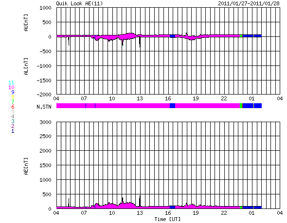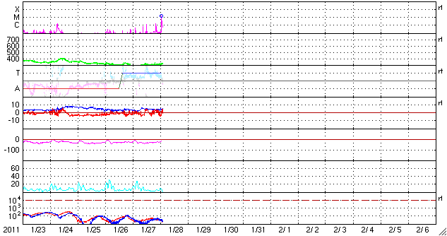 2011/ 1/28 12:11 更新 西に没した1149黒点群でM1の中規模フレアが発生しました。太陽風は低速です。 担当 篠原 今朝、28日10時(世界時28日1時)に、西の端に沈んだ1149黒点群で、 M1.3の中規模フレアが発生しました。 GOES衛星のX線カメラが、その残りの輝きを捉えています。 没したところで発生したフレアなので、 実際にはこれよりも規模は大きかった可能性があります。 X線のグラフを見ると、昨日のニュースの後より、 1149黒点群は再び活発化していて、 Bクラスの小さなフレアを数回起こした後、C1.2、C1.5と2つの小規模フレアに発達し、 そして今朝のMクラスとなったようです。 これと連動しているのだと思いますが、 SDO衛星のAIA304カメラで、太陽の西端の活発な変動が撮影されています。 SOHO LASCO C2とともに動画にして、2枚目に掲載しています。 SOHO LASCO C2では、CMEがいくつも飛び出しています。 最後のCMEは、M1フレアに関係した噴き上がりかもしれません。 地球から見ると、活動は全て太陽の横で発生しているので、太陽風への影響はありません。 太陽風は、かなり低い速度の穏やかな状態が続いています。 昨日は280km/秒まで下がっていましたが、その後やや上がって、現在は320km/秒です。 だいぶ遅い風であることは変わりません。 磁場強度は、5nTと平均的な強さです。 速度が遅くなり、磁気圏も静穏です。 AE指数はほとんど変化していません。 小さな振れがありますが、それは太陽風磁場が南を向いたことによる影響です。 この後も、穏やかな太陽風が続きます。 SDO AIA193では、東端のコロナホールの姿が少しずつ見やすくなっています。 影響の開始は、6〜7日程度先です。 新燃岳の噴火は、昨日も活発でした。 昼頃まではおとなしめだったのですが、15時過ぎから激しさを増して、 16時頃は、掲載の動画の様な光景でした。 今日の動画は、10秒間隔です。 途中、速度が遅くなるところは1秒間隔です。 鹿児島空港へ着陸する飛行機が画面を横切っています。 飛行機からは絶景でしょうか。 深夜、一時的に風向きが変わったようで、 火山灰が降ってきて、車にうっすらと積もりました。 その時は、風のにおいまで硫黄臭く感じられて、 暗くて見えないだけに不気味でした。 今日は曇り空で、山はよく見えません。 太陽の西端の1149黒点群でM1.3の中規模フレアが発生しました。 (c) NOAA/SWPC ![]() SDO AIA304とSOHO LASCO C2による27日から28にかけての太陽。西端で様々な活動が見えます。 (c) SDO (NASA)、SOHO (ESA & NASA)、動画加工 : 宇宙天気ニュース ![]() 27日午後の霧島山新燃岳の噴火の様子。10秒間隔で撮影した動画です。 (c) 宇宙天気ニュース ![]() SDO衛星のAIA193カメラによる太陽コロナの様子 (c) SDO (NASA) ![]() SDO衛星による太陽の可視光写真 (c) SDO (NASA) ![]() GOES衛星の太陽X線データ (c) NOAA/SWPC ![]() ACEが観測した太陽風の磁場(1番上の枠、白線は全体の強度、赤線は南北成分) および、太陽風の密度(3番目の橙線)、速度(4番目の黄線) (c) NOAA/SWPC ![]() リアルタイムAE指数 下段のAEグラフの値が高くなると、オーロラ活動が活発化しています。 (c) 京都大学, NICT ![]() 27日の太陽周期に合わせたデータプロット 太陽が同じ面を地球に向けていた27日前の変化から、今後を予想することができます。 (c) 作図:宇宙天気ニュース