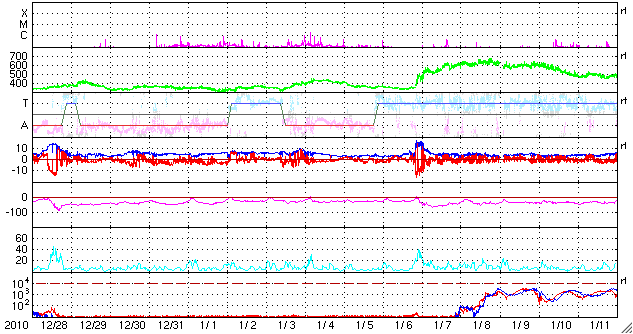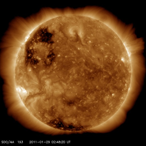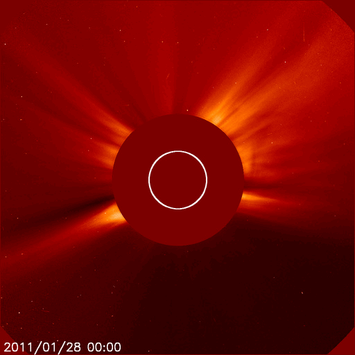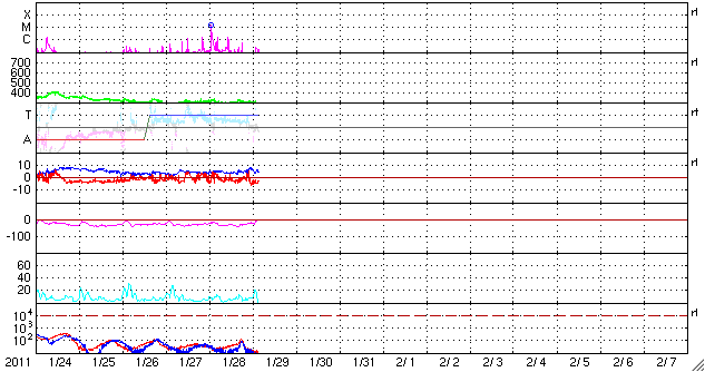 2011/ 1/29 12:43 更新 太陽の西側にCMEが飛び出しています。太陽風はかなり遅い速度です。 担当 篠原 昨日朝のM1.3の中規模フレアに続いて発生したCMEを動画で紹介します。 SOHO衛星のLASCO C2、C3カメラの写真です。 爆発的というか、飛び散るような噴きだし方をしています。 地球からは横に向かっているので、影響はありません。 このフレアを起こした1149黒点群は西に沈みました。 そして、1150、1151と2つの黒点群が発生したそうです。 1150群は、太陽の可視光写真の東端やや南寄り(左端やや下)に、白斑と共に見えています。 1151群は北西(右上)寄りだそうですが、掲載の写真では見つけることができません。 NOAAの報告によると、1150黒点群はBクラスの小さなフレアを起こしているようです。 この後の活動に注目してください。 太陽風は、再び280km/秒へ速度(ACEの図の黄色線)が下がっています。 かなり遅い速度になっています。 一方、太陽風の磁場強度(白線)は5nTと平均的な強さを保っていて、 南北成分(赤線)はずっと南(マイナス側)を向いています。 このため、速度はかなり遅いものの、小規模の磁気圏活動が発生しています。 AE指数には300nTから500nTの変化が発生しています。 しかし、この後5日程度は速度の遅い太陽風が続くと考えられ、 磁気圏活動も基本的には穏やかでしょう。 SDO AIA193によると、コロナホールは次第に太陽の中心へ向かっていて、 明後日くらいに先頭部(右端)が太陽の中心線に達しそうです。 高速の太陽風が地球へ届くのはその3日後と見積もると、 2月3日あたりが次の擾乱の始まりになりそうです。 前周期は、ここから活発なオーロラ活動が発生しました。 オーロラ観望では楽しみに待っていて下さい。 SOHO LASCO C2、C3による、西方向へのCMEの噴出。 (c) SOHO (ESA & NASA)、動画加工 : 宇宙天気ニュース ![]() SDO衛星のAIA193カメラによる太陽コロナの様子 (c) SDO (NASA) ![]() SDO衛星による太陽の可視光写真 (c) SDO (NASA) ![]() GOES衛星の太陽X線データ (c) NOAA/SWPC ![]() ACEが観測した太陽風の磁場(1番上の枠、白線は全体の強度、赤線は南北成分) および、太陽風の密度(3番目の橙線)、速度(4番目の黄線) (c) NOAA/SWPC ![]() リアルタイムAE指数 下段のAEグラフの値が高くなると、オーロラ活動が活発化しています。 (c) 京都大学, NICT ![]() 27日の太陽周期に合わせたデータプロット 太陽が同じ面を地球に向けていた27日前の変化から、今後を予想することができます。 (c) 作図:宇宙天気ニュース