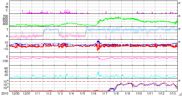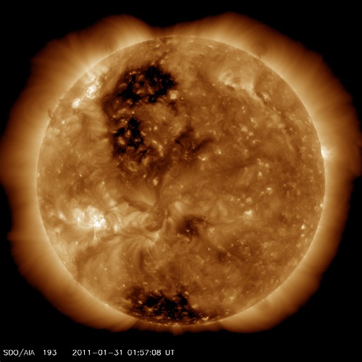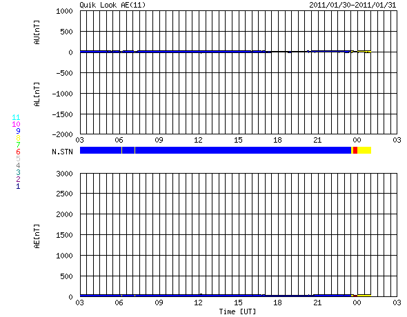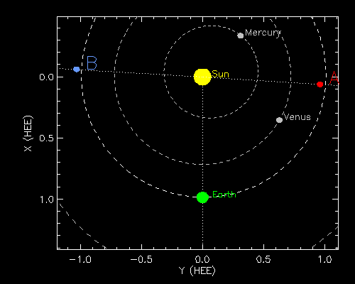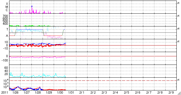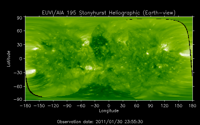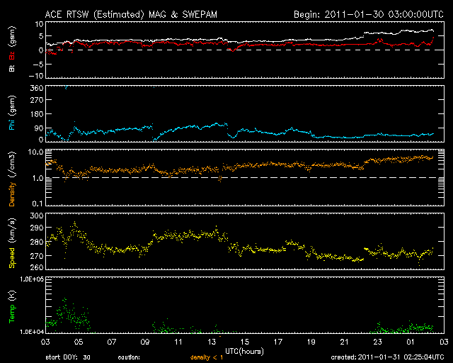 2011/ 1/31 11:25 更新 太陽風は速度が遅く、磁気圏も静穏です。コロナホールが中心に達しています。 担当 篠原 2月に入ると、STEREOのAheadとBehindが太陽をはさんで180度に開き、 太陽の全体を一望できる日がいよいよやって来ます。 STEREOの軌道計算のページによると、 日本時間で6日から7日にかけて最も離れることになるようです。 (あくまでこのページの計算精度の中での話です) STEREOの最新情報によると、 9日(日本だと10日ではないでしょうか)にNASAが公式発表を行うそうです。 予告の動画も公開していて、盛り上がっています。 (たいした内容ではありませんが・・・) 今後は、SOHOやSDOなどと組み合わせることで、 太陽の全体を常に観測できるようになり、素晴らしいことです。 参考までに、上記の計算ページで得られた2機が最も離れた時の図と、 完全に埋まる直前の、今日の太陽地図を掲載します。 その太陽は、1150黒点群が南東に見えていますが、 活動は落ち着いていて、Bクラスの小さな変化を起こしている程度です。 このまま穏やかに推移しそうです。 太陽風は、速度が270km/秒に下がり、更に遅くなっています。 磁場強度は、3nTに弱まっていたものが、 今朝に入って6nTにやや強まっています。 しかし、この後に変動が続くということもなさそうです。 太陽風も穏やかに推移すると思われます。 磁気圏も全く静穏で、AE指数は全く変化していません。 これは、速度が遅いこともありますが、 磁場の南北成分が現在は北寄りに変わっている影響が大きいでしょう。 SDO AIA193では、コロナホールはいよいよ太陽の中心に達し、 地球への影響開始は秒読み段階です。 すでに中心を通りすぎていることを考慮すると、 2〜3日後から太陽風の変動が始まるかもしれません。 コロナホールの規模も大きく、しっかりした高速風がやって来そうです。 新月に近いことから、オーロラの観望にはチャンスでしょう。 ライブカメラなどに注目してください。 STEREO AheadとBehindが最大に離れる、2011年2月6〜7日頃の様子。 (c) STEREO (NASA) ![]() STEREOとSDOによる、太陽コロナの全球地図。360度が完全に埋まる直前で、細い隙間が残っている。 (c) STEREO (NASA)、SDO (NASA) ![]() SDO衛星のAIA193カメラによる太陽コロナの様子 (c) SDO (NASA) ![]() SDO衛星による太陽の可視光写真 (c) SDO (NASA) ![]() GOES衛星の太陽X線データ (c) NOAA/SWPC ![]() ACEが観測した太陽風の磁場(1番上の枠、白線は全体の強度、赤線は南北成分) および、太陽風の密度(3番目の橙線)、速度(4番目の黄線) (c) NOAA/SWPC ![]() リアルタイムAE指数 下段のAEグラフの値が高くなると、オーロラ活動が活発化しています。 (c) 京都大学, NICT ![]() 27日の太陽周期に合わせたデータプロット 太陽が同じ面を地球に向けていた27日前の変化から、今後を予想することができます。 (c) 作図:宇宙天気ニュース