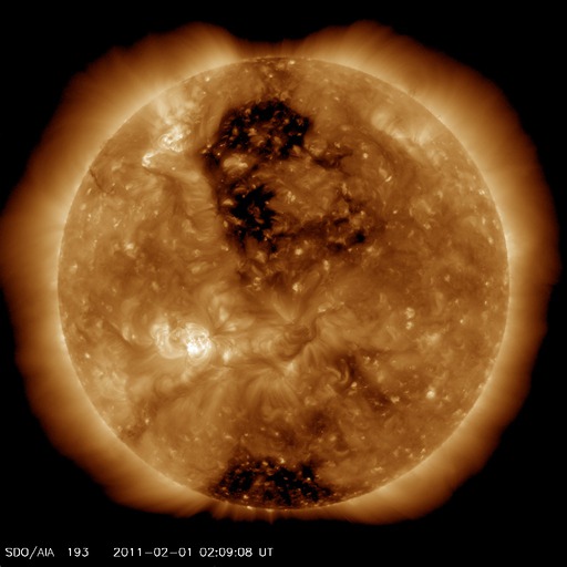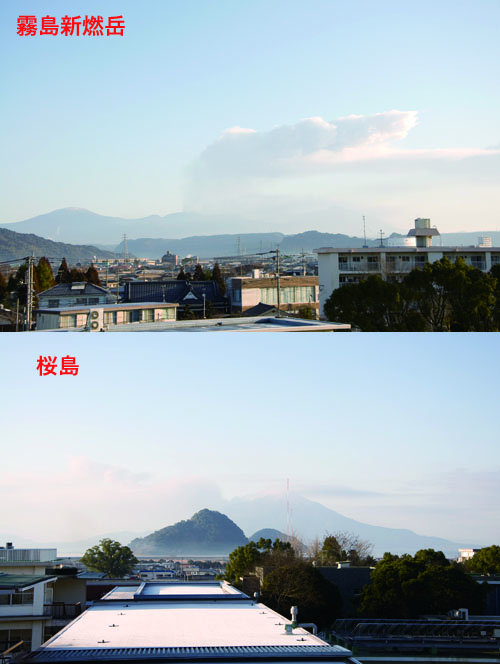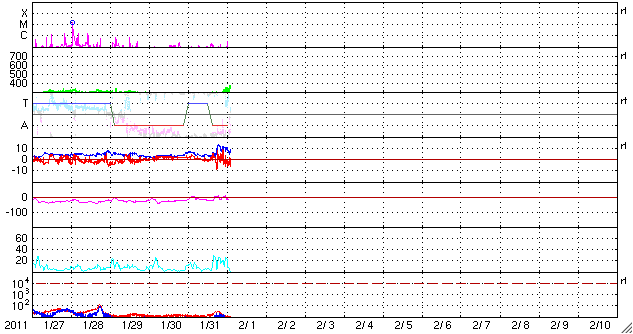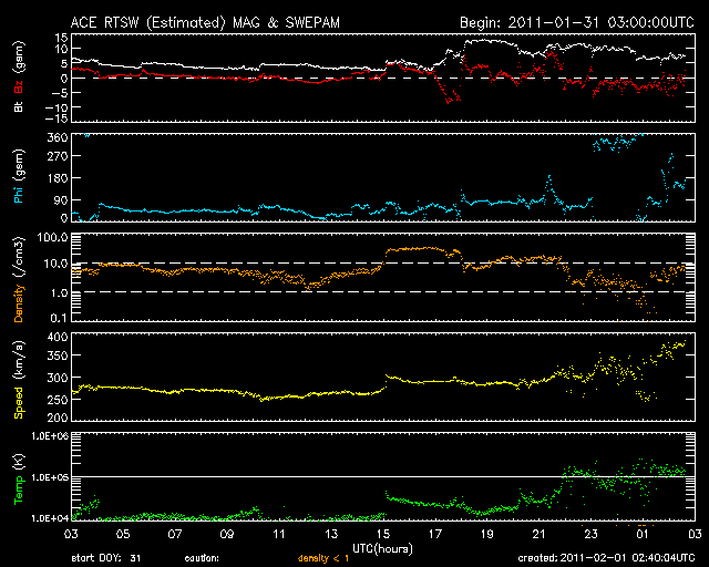 2011/ 2/ 1 11:41 更新 太陽風の速度が370km/秒に回復しています。高速風の到来は明日以降になるでしょう。 担当 篠原 今朝の8時頃、どどーんと雷鳴の様なすごい音を轟かせて、 新燃岳が大きな噴煙を上げました。 外を歩いている時だったので、背後から突然やってきた爆発音にとても驚きました。 爆発の約20分後の写真を紹介します。 少し下にたなびいているのが、大きな噴煙の跡です。 また、今日は負けじと桜島もがんばって噴煙を上げていました。 (山の左側の中腹から上がっている雲が噴煙です。一番いいタイミングは逃しました) 前門の虎、後門の狼でもありませんが、北に新燃岳、南に桜島と豪快な環境です。 昨日、270km/秒まで速度が下がっていた太陽風ですが、 その後、更に250km/秒近くまで下がりました。 しかし、今日に入った頃から磁場強度が高まり、 2月1日3時(世界時31日18時)には、13nTに達する変化を見せています。 そこからはゆっくりと下がって、現在は7nTほどなのですが、 これに連動して速度が上昇を始め、 現在370km/秒と、まだ低速ですがかなり回復しています。 SDO AIA193の太陽コロナ写真の中央に大きく見えている コロナホールの影響はまだ早そうなので、 一時的な変動ではないかと思います。 といっても、明日か明後日にはコロナホールの影響が始まると思われます。 コロナホールは、北半球側に大きく広がっています。 現在、太陽の中心に位置している領域から、 地球の方向に高速の太陽風が飛び出しているところです。 地球までは、およそ3日間の旅です。 太陽の活動は静穏です。 1150黒点群は特に変化はなく、X線のグラフはBクラスの小さな変化が見えるだけです。 今朝の新燃岳と桜島の噴煙。霧島の隼人からは、北と南によく見えます。 (c) 宇宙天気ニュース ![]() SDO衛星のAIA193カメラによる太陽コロナの様子 (c) SDO (NASA) ![]() SDO衛星による太陽の可視光写真 (c) SDO (NASA) ![]() ACEが観測した太陽風の磁場(1番上の枠、白線は全体の強度、赤線は南北成分) および、太陽風の密度(3番目の橙線)、速度(4番目の黄線) (c) NOAA/SWPC ![]() リアルタイムAE指数 下段のAEグラフの値が高くなると、オーロラ活動が活発化しています。 (c) 京都大学, NICT ![]() 27日の太陽周期に合わせたデータプロット 太陽が同じ面を地球に向けていた27日前の変化から、今後を予想することができます。 (c) 作図:宇宙天気ニュース