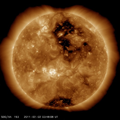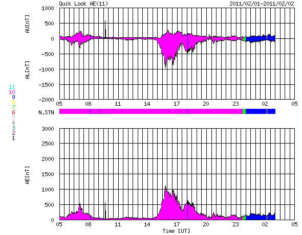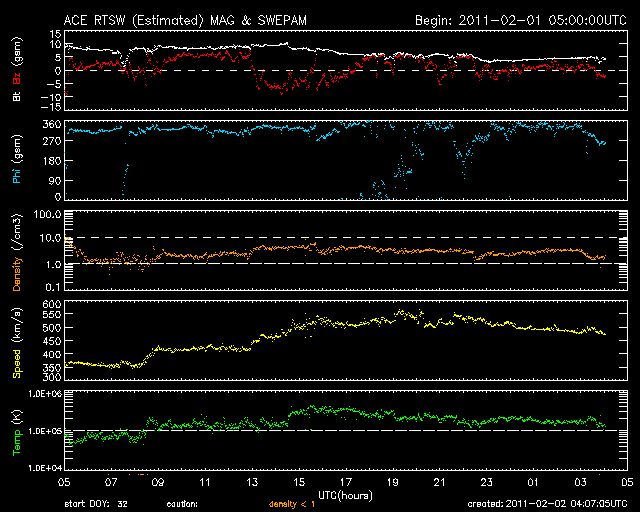 2011/ 2/ 2 13:07 更新 やや早めに高速太陽風が始まりました。激しいオーロラ活動も発生しています。 担当 篠原 昨日の磁場の強まりは、高速太陽風の始まりでした。 昨日の夕方、1日17時(世界時1日8時)から、太陽風の速度は上昇を始め、 半日ほどかけて550mk/秒まで上がりました。 その後も、高速状態を保っていて、現在の太陽風の速度は500km/秒ほどです。 15nT近くまで強まっていた磁場強度は、速度が上がり始めると低下して、 現在は5nTと平均的な強さで落ち着いています。 コロナホールの見え方から考えると、地球は少し早めに高速風領域に入った印象ですが、 現在のSDO AIA193では、北半球のコロナホールは西側へ進んで、 地球への影響の開始位置に届いています。 従って、高速風領域としての本番はこれからではないかと思います。 この後、更にもう一段高い速度に変化する可能性があります。 速度が高まり始めた頃に、-5nTを超える南向きの磁場がやって来ました。 今日のACEの図では、南を向いているのはこの時間帯くらいなのですが(図の中間あたり)、 ここで、AE指数1000nTに達する激しいオーロラ活動が発生しています。 磁場の強まりの残る高速風の立ち上がりという、 オーロラ観望としては最も狙い目のタイミングでの、活発な活動です。 磁場の南北成分は、その後は0nT付近からやや北寄りになっています。 このため、オーロラの活動は低調になっています。 磁場の傾向が変わると、再び活発化すると思われますので、注目してください。 一方、太陽の活動は静穏です。 1150黒点群は特に変化なく、 X線のグラフはBクラスの小さな変化が見られている程度です。 SDO衛星のAIA193カメラによる太陽コロナの様子 (c) SDO (NASA) ![]() SDO衛星による太陽の可視光写真 (c) SDO (NASA) ![]() ACEが観測した太陽風の磁場(1番上の枠、白線は全体の強度、赤線は南北成分) および、太陽風の密度(3番目の橙線)、速度(4番目の黄線) (c) NOAA/SWPC ![]() リアルタイムAE指数 下段のAEグラフの値が高くなると、オーロラ活動が活発化しています。 (c) 京都大学, NICT ![]() 27日の太陽周期に合わせたデータプロット 太陽が同じ面を地球に向けていた27日前の変化から、今後を予想することができます。 (c) 作図:宇宙天気ニュース