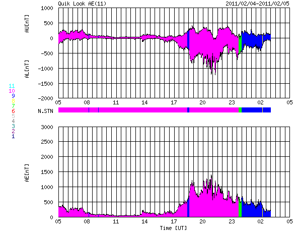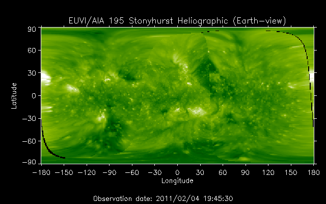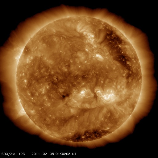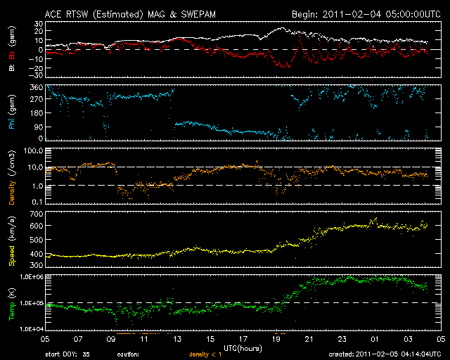 2011/ 2/ 5 13:14 更新 速度600km/秒に達する高速太陽風が始まっています。強い南向き磁場の影響で、活発な磁気圏活動が発生しています。 担当 篠原 太陽の観測網が360度の全球に達するのもあと少しです。 今日のSTEREOページの太陽地図に残る隙間は、 いよいよあと少しとなりました(掲載の写真)。 作図の関係で、画像から隙間が消えるタイミングがいつになるか分かりませんが、 すぐそこまで近づいていることは確かです。 いよいよコロナホールによる高速の太陽風が始まりました。 先ず、4日18時(世界時4日9時)頃から磁場強度が10nTに強まりました。 その後もじわじわと上昇は続き、 今日の早朝、5日4時(世界時4日19時)には、20nTにまで達しています。 その頃から速度の上昇も始まり、 5時間ほどで400km/秒から600km/秒まで上昇しました。 磁場強度はこの変化と反対に、10nTへと下がっています。 しかし、依然通常よりも強い状態です。 磁場強度が最大になった頃、太陽風の磁場の南向き成分も、 最大で-20nT近くまでかなり強く南を向きました。 速度の高まりと重なって、かなり激しい磁気圏活動をもたらしています。 AE指数は最大1300nTに達する激しい活動が発生しています。 そして、5日3時(世界時4日18時)以降、 8時間にわたって500nT以上の変動が観測されています。 北極域では、かなりにぎやかなオーロラを見ることができた様です。 一方、京大WDCのDst指数は-60nT程減少していて、 小規模の磁気嵐が発生しています。 太陽風は、現在も600km/秒近くとかなり高速です。 磁場強度は10nT近くでまだ弱まっておらず、引き続き太陽風の変化に注意が必要です。 磁場強度が強まっているため、南向き成分も高まりやすく、 オーロラ活動は今後も続きそうです。 今夜もライブカメラに注目してください。 SDO AIA193では、コロナホールは、だいぶ西端に近付きました。 太陽風の速度は高まりましたが、継続期間は3日程度の規模ではないでしょうか。 放射線帯高エネルギー電子は、現在は低いレベルです。 しかし、今回の太陽風の擾乱の影響を受けて、増加する可能性があります。 今後の変化に注目してください。 太陽は、1152黒点群がBクラスのフレアを度々発生させています。 最大はB9.5で、あと一歩でCクラスに入る規模でした。 特に激しくなる様子は見られませんが、Cクラスには達するかもしれません。 また、北半球の中央部に、新しく1153黒点群が発生したのですが、 既に縮小していて、掲載の写真では見つけることができません。 STEREOとSDOによる、太陽コロナの全球地図。残る隙間もあとわずか。 (c) STEREO (NASA) ![]() SDO衛星のAIA193カメラによる太陽コロナの様子 (c) SDO (NASA) ![]() SDO衛星による太陽の可視光写真 (c) SDO (NASA) ![]() ACEが観測した太陽風の磁場(1番上の枠、白線は全体の強度、赤線は南北成分) および、太陽風の密度(3番目の橙線)、速度(4番目の黄線) (c) NOAA/SWPC ![]() リアルタイムAE指数 下段のAEグラフの値が高くなると、オーロラ活動が活発化しています。 (c) 京都大学, NICT ![]() 27日の太陽周期に合わせたデータプロット 太陽が同じ面を地球に向けていた27日前の変化から、今後を予想することができます。 (c) 作図:宇宙天気ニュース