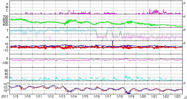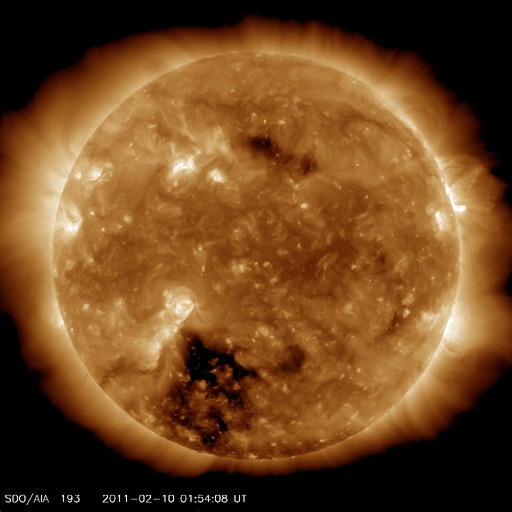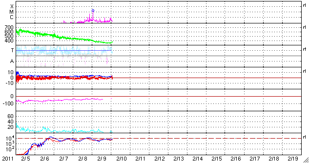 2011/ 2/10 11:17 更新 太陽ではBクラスの小さな活動が続いています。太陽風は低速で穏やかです。 担当 篠原 太陽では、Bクラスの小さなフレア活動が続いています。 そのほとんどは、北半球の西端(右端)にある1153黒点群で発生し、 2つだけが北半球の東側(左側)の1157黒点群で起きています。 1157黒点群と、その南側(下側)の1156黒点群は、 昨日よりも黒点が増えて発達しています。 この後どの様な活動を起こすのか、その様子に注目してください。 また、1153黒点群は没してしまい、地球からは見えなくなっています。 太陽風は、昨夜のうちに350km/秒まで速度が下がりました。 磁場強度も2nTに弱まり、穏やかな太陽風となっています。 ただし、最新のデータでは、速度が370km/秒へ少し上がり、 磁場強度、プラズマの密度も少し変化しています。 大きな変化につながることはなさそうですが、少し注視して下さい。 磁気圏の活動は穏やかです。 AE指数はほとんど変化していません。 SDO衛星AIA193によると、南北両半球に見えるコロナホールは、 それぞれ太陽の中心線を通過し、西半球側に移りつつあります。 どちらも緯度は高めで、地球への影響は及びにくい位置です。 小規模の速度上昇がやって来る程度でしょうか。 到来するなら、2〜3日後くらいに始まりそうです。 放射線帯の高エネルギー電子は、少し下がって、 10,000のラインは割っています。 この後、太陽風に乱れなどが来なければ、ゆっくりと減少していきます。 SDO衛星のAIA193カメラによる太陽コロナの様子 (c) SDO (NASA) ![]() SDO衛星による太陽の可視光写真 (c) SDO (NASA) ![]() GOES衛星の太陽X線データ (c) NOAA/SWPC ![]() ACEが観測した太陽風の磁場(1番上の枠、白線は全体の強度、赤線は南北成分) および、太陽風の密度(3番目の橙線)、速度(4番目の黄線) (c) NOAA/SWPC ![]() リアルタイムAE指数 下段のAEグラフの値が高くなると、オーロラ活動が活発化しています。 (c) 京都大学, NICT ![]() 27日の太陽周期に合わせたデータプロット 太陽が同じ面を地球に向けていた27日前の変化から、今後を予想することができます。 (c) 作図:宇宙天気ニュース