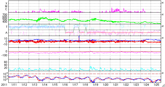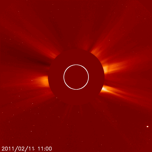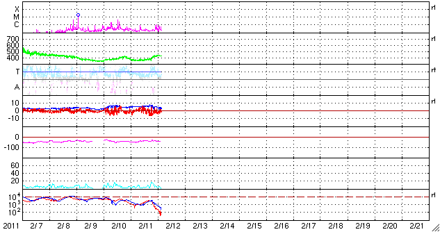 2011/ 2/12 12:54 更新 太陽の東側でフレアとCMEが発生しています。太陽風は400km/秒台に上がりました。 担当 篠原 太陽の東側に活発な領域がある様です。 フレアとそれに伴うCMEが観測されています。 今日1枚目の動画は、STEREO BehindのEUVI195による太陽の東側のコロナの様子です。 中央部に明るい活動的な領域があり、そこでフレアが発生しています。 この領域は、この後にも一段大きな爆発を起こしていて (STEREO Behondの画像はまだ更新されていません)、 それによるCMEがSOHO LASCO C2で撮影されています(3枚目の動画)。 2枚目の動画は、SDO AIA304です。 太陽の端で発生しているフレアがよく写っています。 3枚目のLASCO C2の動画では、CMEが2回発生していますが、 一つ目は、STEREO Behindで写っているフレア、 二つ目はこの後に発生したフレアによるものです。 この領域は、もうすぐこちら側に姿を現すでしょう。 黒点などどの様に分布しているのか、注目してください。 太陽のこちら側では、東半球の南北に新しい黒点が発生しています。 なんだか、2日前の写真を見直しているような出現の仕方です。 これで、中心線付近にある1157群(北)、1156群(南)と、 東側の1159群(北)、1158群(南)と、4つの黒点群が見えています。 東西南北にそろった出現をしていて、印象的です。 太陽風は、今日未明、12日3時(世界時11日18時)から速度が上がり、 それまでの360km/秒の低速風から、430km/秒と若干高めの速度に変わっています。 コロナホールの弱い影響がやって来たということでしょうか。 磁場強度は4nTと弱めになっており、速度が更に大きく上がることはなさそうです。 磁気圏活動は、AE指数で500nT規模の変動が観測されていますが、 それ以外は基本的には穏やかの様です。 コロナホールの位置から考えると、太陽風への影響は更に3日程度続くかもしれません。 STEREO Behind EUVI195による、太陽の東側で発生したフレア。 (c) STEREO (NASA) ![]() SDO AIA 304による太陽の東端のフレアの様子。 (c) SDO (NASA)、動画加工 : 宇宙天気ニュース ![]() SOHO LASCO C2カメラによる、CMEの様子。 (c) SOHO (ESA & NASA) ![]() SDO衛星のAIA193カメラによる太陽コロナの様子 (c) SDO (NASA) ![]() SDO衛星による太陽の可視光写真 (c) SDO (NASA) ![]() GOES衛星の太陽X線データ (c) NOAA/SWPC ![]() ACEが観測した太陽風の磁場(1番上の枠、白線は全体の強度、赤線は南北成分) および、太陽風の密度(3番目の橙線)、速度(4番目の黄線) (c) NOAA/SWPC ![]() リアルタイムAE指数 下段のAEグラフの値が高くなると、オーロラ活動が活発化しています。 (c) 京都大学, NICT ![]() 27日の太陽周期に合わせたデータプロット 太陽が同じ面を地球に向けていた27日前の変化から、今後を予想することができます。 (c) 作図:宇宙天気ニュース