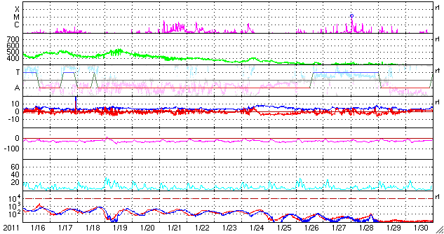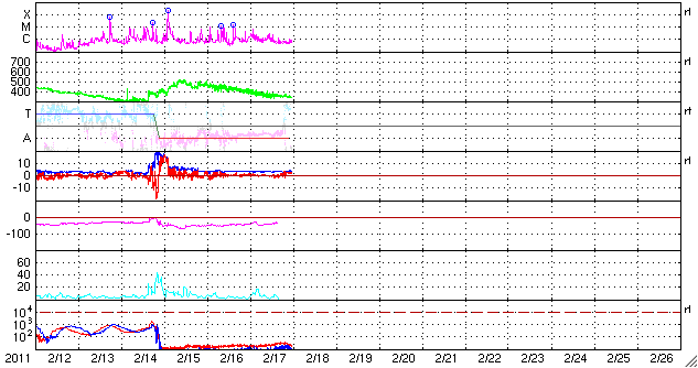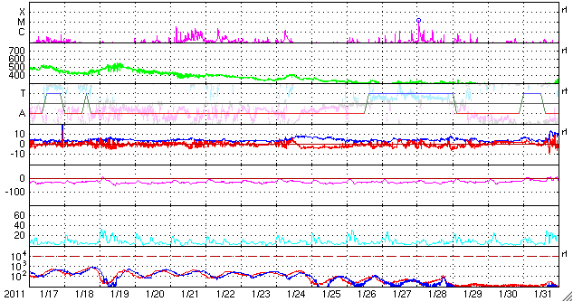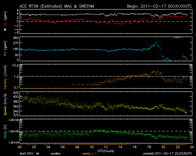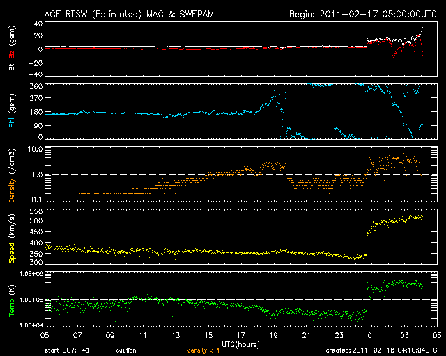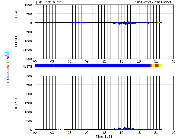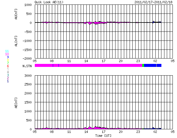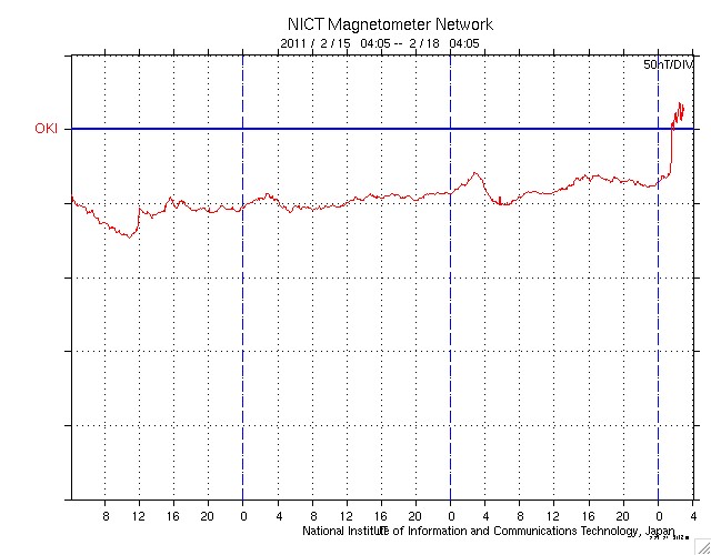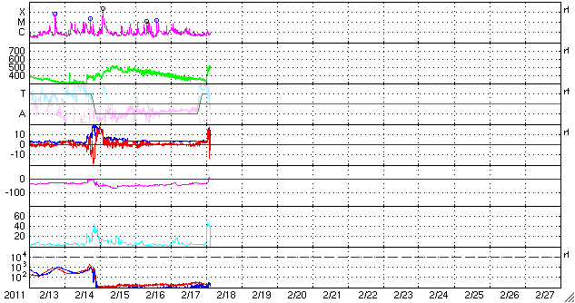 2011/ 2/18 13:11 追加 ACEが観測した太陽風の磁場(1番上の枠、白線は全体の強度、赤線は南北成分) および、太陽風の密度(3番目の橙線)、速度(4番目の黄線) (c) NOAA/SWPC ![]() 沖縄の磁場擾乱 下へ下がるほど、擾乱が発達している事を意味します。 (c) NICT ![]() リアルタイムAE指数 下段のAEグラフの値が高くなると、オーロラ活動が活発化しています。 (c) 京都大学, NICT ![]() 27日の太陽周期に合わせたデータプロット 太陽が同じ面を地球に向けていた27日前の変化から、今後を予想することができます。 (c) 作図:宇宙天気ニュース