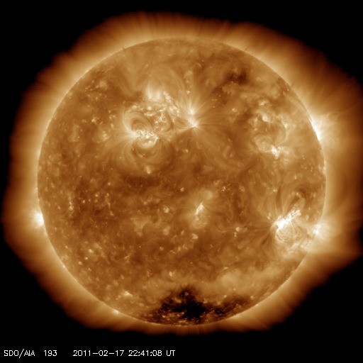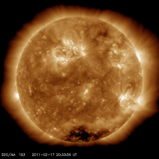 2011/ 2/18 08:23 更新 高速風はまだ始まっていません。到来が遅れるほど、乱れは小さいものになります。 2011/ 2/18 13:11 追加 500km/秒の高速太陽風が到来しました。磁場が強まっているので、南向きに注意が必要です。 担当 篠原 18日の朝になりましたが、太陽風は350km/秒と低速のままです。 X2.2フレアによって発生した高速の太陽風の到来はまだです。 昨日掲載した予想の、600km/秒の場合の時間も通りすぎつつあります。 従って、やって来る擾乱はそれほど大きなものではなさそうです。 この後、いつ始まってもよさそうな時間になっています。 ACEの最新データに注目して下さい。 1158黒点群は、大きな姿を保っていますが、 活動は落ち着きつつあり、昨日のニュース以降はC2のフレアが最大です。 1161黒点群も姿は大きいですが、目立ったフレアは起こしていません。 今朝は、ひとまず速報として現況を掲載します。 高速風が始まった頃に、また続報を。 2011/ 2/18 13:11 追加 (篠原) 関連の図はページの最後にあります 18日09:40 (世界時18日00:40)に、 ACE衛星で太陽風の急な速度上昇が観測されました。 15日のX2.2の大規模フレアに伴って発生したCMEの影響がやって来たのだと思われます。 速度の変化は、350km/秒からおよそ500km/秒へ上がった程度で、 それほど大きな変化ではありません。 昨日の予想図の中では、最も遅い予想に近い結果となりました。 磁場強度は15nTに強まって、3時間ほど経った現在、20nTにもう一段強まっています。 地球への影響度を決める南北成分は、概ね北寄りで推移しています。 ここまでの変化では、途中に20分ほど-10nTの強い南向きになった部分がありますが、 その後は北寄りに戻っています。 従って、ここまでの変化では磁気圏への影響は限定的でしょう。 AE指数のグラフは、まだほとんど変化を捉えていません。 沖縄の磁場データでは、 18日11時(世界時18日2時)少し前くらいに、磁場が30nTほど+側に急増しています。 太陽風の速度が急増して、圧力が強まった影響です。 (沖縄のグラフは全体として-50nTほどマイナスに下がっていますが、 これは作図の問題で、磁気嵐などの変化ではありません) 今後の変動ですが、速度がそれほど高まっていないので、 特に激しい擾乱にはならないでしょう。 磁場の方向は、今は北寄りになっていますが、 時間とともに逆転することも多いので、強度が強まっている間は注意が必要です。 傾向が変わると、磁気圏はすぐに活動的に変わります。 高速風の影響は、2日くらいというところでしょうか。 太陽の活動は落ち着いて来ています。 昨日のニュース以降は、Cクラス前半の小規模のフレアしか発生していません。 1158黒点群の活動もここまでなのでしょうか。 太陽の北半球には1161黒点群も大きな姿を見せていますが、 こちらは目立ったフレアは起こしておらず、現状では活動度は高くありません。 ACEが観測した太陽風の磁場(1番上の枠、白線は全体の強度、赤線は南北成分) および、太陽風の密度(3番目の橙線)、速度(4番目の黄線) (c) NOAA/SWPC ![]() SDO衛星による太陽の可視光写真 (c) SDO (NASA) ![]() SDO衛星のAIA193カメラによる太陽コロナの様子 (c) SDO (NASA) ![]() GOES衛星の太陽X線データ (c) NOAA/SWPC ![]() リアルタイムAE指数 下段のAEグラフの値が高くなると、オーロラ活動が活発化しています。 (c) 京都大学, NICT ![]() 27日の太陽周期に合わせたデータプロット 太陽が同じ面を地球に向けていた27日前の変化から、今後を予想することができます。 (c) 作図:宇宙天気ニュース
