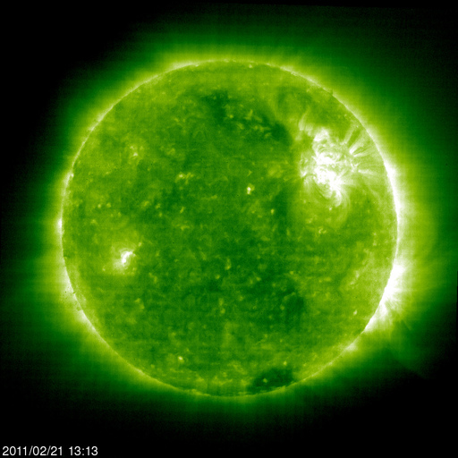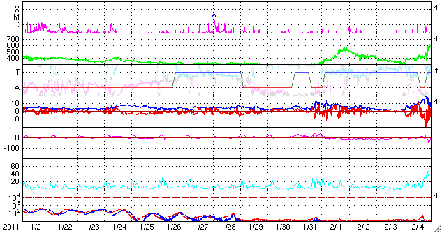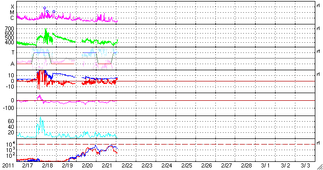 2011/ 2/22 11:42 更新 1158黒点群は小規模フレアを起こしながら西に没していきました。 担当 篠原 1158黒点群は、没するまでフレア活動を続けました。 GOESのX線グラフを見ると、昨日のニュースの後から、 Cクラスの小規模フレアが頻発しています。 最大のフレアは、21日19時(世界時21日10時)のC7.8です。 地球からは半ば見えなくなった状態での発生なので、 本当の規模はこれより大きかった可能性があります。 そして、1158群が見えなくなるとともに、X線の変動もなくなり、 太陽は落ち着いています。 現在見えている黒点は、1161群と1162群です。 こちらの活動度は下がっているようです。 太陽風は、400km/秒を中心に350〜420km/秒の範囲で変化していて、 平均的な速度域で推移しています。 磁場強度も、5nTと平均的な強さで安定しています。 ACEのデータの最新部では、磁場強度が6nTに少し上がり、 速度も450km/秒へやや上がっています。 特に大きく変化することはないと思いますが、少し注目してください。 太陽風磁場の南北成分は、昨日に続いて南寄りで推移しています。 このため、AE指数で500nTと中規模の磁気圏活動が続いています。 極域はきれいなオーロラが見えていたのではないでしょうか。 しかし、ACEの最新データを見ると、磁場の方向が北向きに切り替わっています。 今後も北向きが続くなら、磁気圏は静穏に変わります。 放射線帯高エネルギー電子の増加は、10,000には達せずに止まりました。 高めの状態が続いていますが、今後はゆっくりと減少していくでしょう。 SOHO衛星のEIT195カメラによる太陽コロナの様子 (c) SOHO (ESA & NASA) ![]() SDO衛星による太陽の可視光写真 (c) SDO (NASA) ![]() GOES衛星の太陽X線データ (c) NOAA/SWPC ![]() ACEが観測した太陽風の磁場(1番上の枠、白線は全体の強度、赤線は南北成分) および、太陽風の密度(3番目の橙線)、速度(4番目の黄線) (c) NOAA/SWPC ![]() リアルタイムAE指数 下段のAEグラフの値が高くなると、オーロラ活動が活発化しています。 (c) 京都大学, NICT ![]() 27日の太陽周期に合わせたデータプロット 太陽が同じ面を地球に向けていた27日前の変化から、今後を予想することができます。 (c) 作図:宇宙天気ニュース