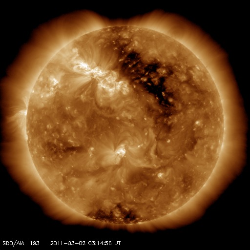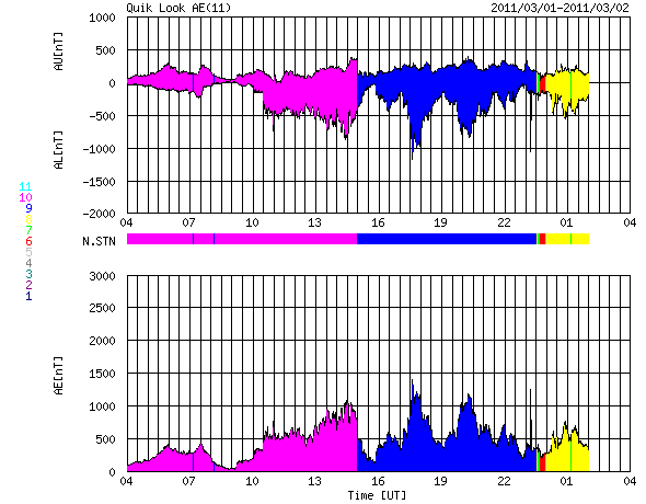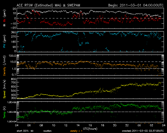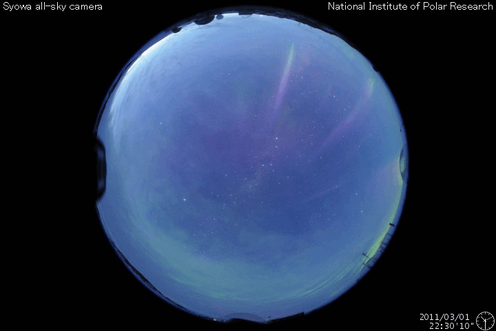 2011/ 3/ 2 12:38 更新 コロナホールによる高速太陽風が始まりました(700km/秒)。強い南向き磁場の影響でオーロラが活発に発生しています。 担当 篠原 予想よりも早めに、昨日からコロナホールによる高速の太陽風が始まりました。 まず、磁場強度が次第に強まり、 3月1日13時(世界時1日4時)頃に10nTに達しました。 速度は、やっと400km/秒に上がった程度でしたが、磁場の南北成分が大きく南に傾き、 これ以降、半日にわたって-10nT前後の南向きが続いています。 磁場強度は、さらに15nTにまで強まりました。 速度も段階的に、500km/秒、600km/秒と上がり、 現在は650km/秒の高速風となっています。 強い南向き磁場の影響で、磁気圏はかなり活動的になっています。 磁場が強まり始めた頃から、AE指数は500nTほどの変動になり、 その後、太陽風の乱れが強まるにつれてオーロラの強度も強まって、 AE指数は1000nTを超える変動を起こしています。 昨夜は、アラスカのライブカメラ(Live! オーロラ)でも、 とてもきれいなオーロラの輝きを見ることができました。 また、極地研究所によると、南極の昭和基地でもいよいよ観測シーズンが始まっていて、 その最初を飾るようなオーロラの姿が撮影されています。 その動画を掲載します。 現在の太陽風は、磁場強度は5nTに下がっています。 速度は最新のところで700km/秒に達していますが、上昇はこの辺りまでかもしれません。 コロナホールの位置から考えると、最も広い領域の影響はこれからやってきます。 引き続き太陽風のデータ、そして、オーロラの活動に注目してください。 太陽では、1164黒点群の形が大きく変化しています。 磁場の構造がとても複雑になっているようで、 磁場の記号が「βγδ」と3つ付けられています。 磁場が複雑さを増すと、フレアへの注意が必要になります。 昨日のニュース以降は、C6.0の小規模フレアが最大の活動ですが、 再びMクラスの中規模フレアを起こす可能性もあります。 こちらにも注目が必要です。 南極の昭和基地で、全天カメラにより撮影されたオーロラ。南極のシーズンの始まりです。 (c) 国立極地研究所 ![]() SDO衛星のAIA193カメラによる太陽コロナの様子 (c) SDO (NASA) ![]() SDO衛星による太陽の可視光写真 (c) SDO (NASA) ![]() ACEが観測した太陽風の磁場(1番上の枠、白線は全体の強度、赤線は南北成分) および、太陽風の密度(3番目の橙線)、速度(4番目の黄線) (c) NOAA/SWPC ![]() リアルタイムAE指数 下段のAEグラフの値が高くなると、オーロラ活動が活発化しています。 (c) 京都大学, NICT ![]() 27日の太陽周期に合わせたデータプロット 太陽が同じ面を地球に向けていた27日前の変化から、今後を予想することができます。 (c) 作図:宇宙天気ニュース