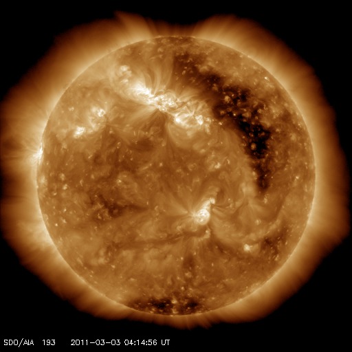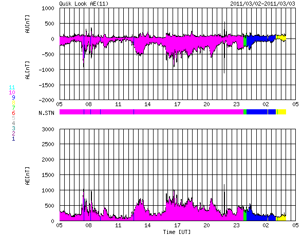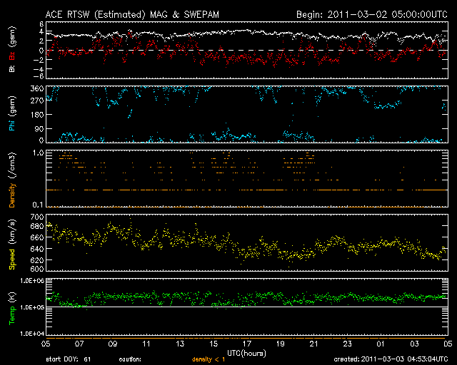 2011/ 3/ 3 13:54 更新 600km/秒台の高速太陽風が続いています。オーロラも活発です。 担当 篠原 快調に高速太陽風が続いています。 昨日、650km/秒に上がった高速風は、そのまま600km/秒台中盤を保ち、 現在は、620〜640km/秒で推移しています。 磁場強度は、4nTから3nT付近で弱まりつつあるようです。 昨日のグラフほどではありませんが、AE指数の変化は今日も活発で、 極域では頻繁にオーロラの活動が発生しているようです。 AE指数の変動は、500nTから最大で1000nTに達しています。 27日周期の図を見て下さい。 今回の高速風の前半部の経過がよく見えています。 3月1日に速度が上昇を始めますが、 その時間帯に太陽風の磁場強度が大きく強まっています (高速の太陽風に押し込まれるためです)。 その時、太陽風磁場の南北成分は強く南を向き(マイナス方向)ました。 すると、磁気圏への影響も強まります。 「沖縄変動」がマイナスへ変化し(磁気嵐の発生を表しています)、 「沖縄短期変動」も激しく増加しています(オーロラ活動の活発化を表しています)。 小さな図ですが、読み取りに慣れると宇宙天気の全体を簡単にモニターすることができます。 今回の高速風の影響で、放射線帯の高エネルギー電子が大きく増加しています。 一気に警戒レベルの10,000に近付いています。 この後も増加は続くと思われるので、今後の変化に注意してください。 太陽は、真ん中に大きく見える1164黒点群に加えて、 東端に新しい黒点が上がってきました。 1166黒点群と番号が付けられています。 どの程度の活動をしている黒点群なのか、注目してください。 SDO衛星のAIA193カメラによる太陽コロナの様子 (c) SDO (NASA) ![]() SDO衛星による太陽の可視光写真 (c) SDO (NASA) ![]() ACEが観測した太陽風の磁場(1番上の枠、白線は全体の強度、赤線は南北成分) および、太陽風の密度(3番目の橙線)、速度(4番目の黄線) (c) NOAA/SWPC ![]() リアルタイムAE指数 下段のAEグラフの値が高くなると、オーロラ活動が活発化しています。 (c) 京都大学, NICT ![]() 27日の太陽周期に合わせたデータプロット 太陽が同じ面を地球に向けていた27日前の変化から、今後を予想することができます。 (c) 作図:宇宙天気ニュース