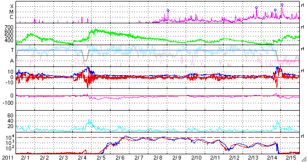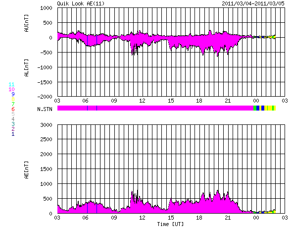 下段のAEグラフの値が高くなると、オーロラ活動が活発化しています。