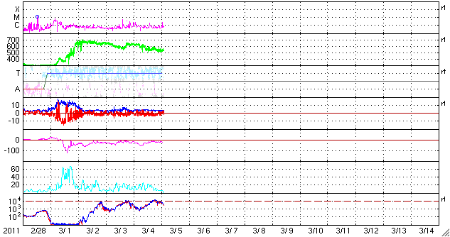 2011/ 3/ 2 12:38 コロナホールによる高速太陽風が始まりました(700km/秒)。強い南向き磁場の影響でオーロラが活発に発生しています。