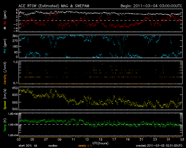 2011/ 3/ 3 13:54 600km/秒台の高速太陽風が続いています。オーロラも活発です。
