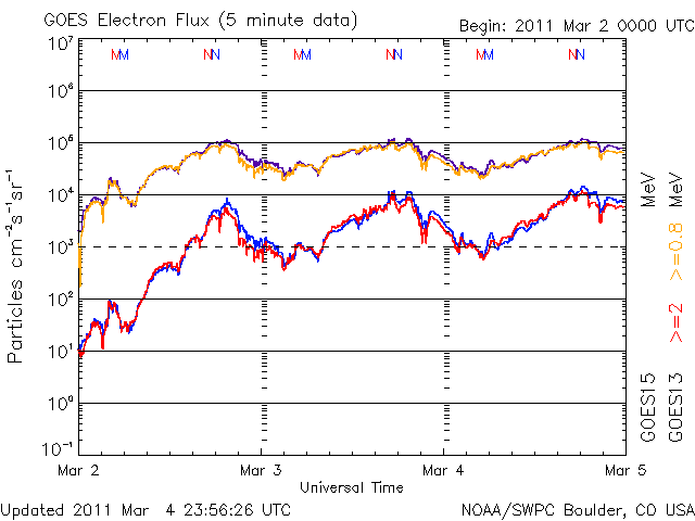 放射線帯の高エネルギー電子は、今日も10,000の警戒レベルに達しています。