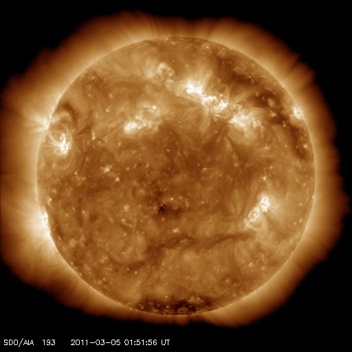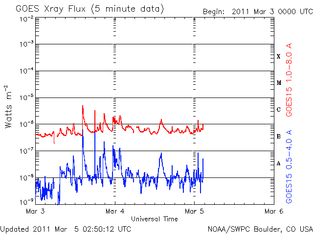 2011/ 3/ 4 12:03 600km/秒台の高速太陽風が続いています。1164黒点群の活動がやや強まっています。