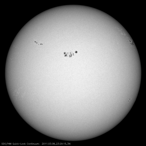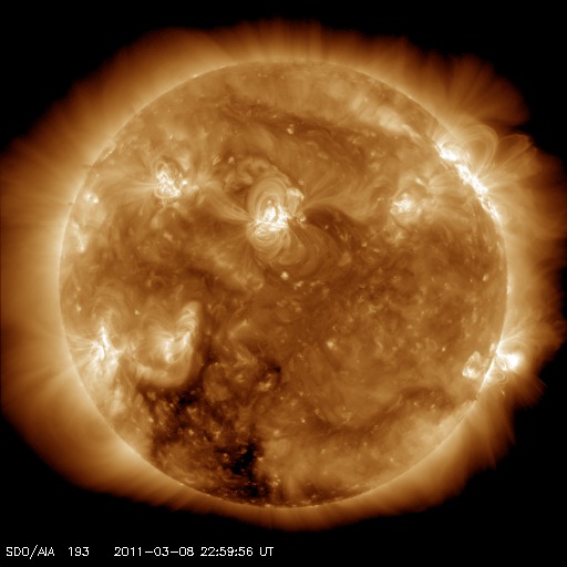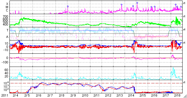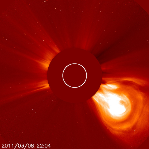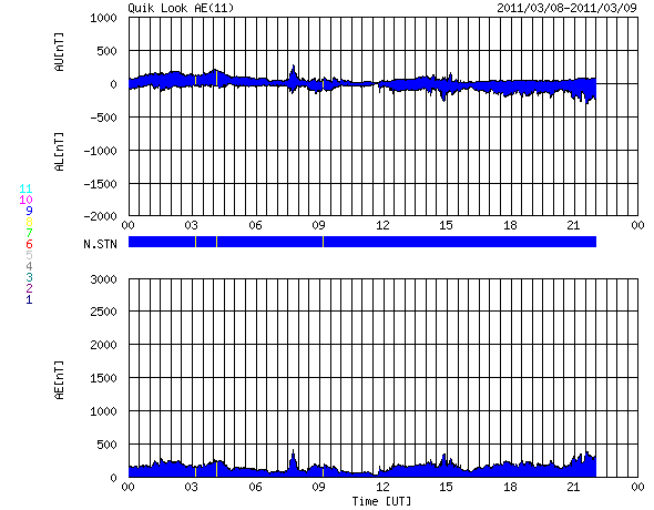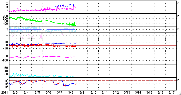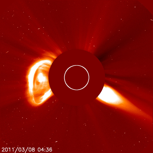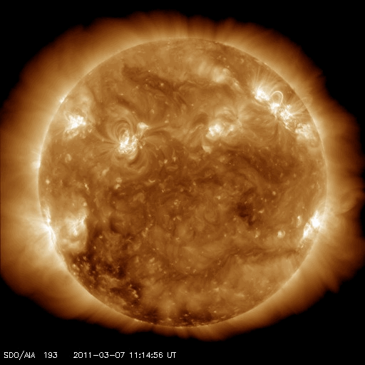 2011/ 3/ 9 08:56 更新 Mクラスフレアの発生が続いています。活発な黒点群が西に没したので、少し落ち着きそうです。 担当 篠原 太陽のフレア活動は活発に続いています。 昨日のニュース以降も、 8日11時半(世界時8日2時半)に、M1.3、1165黒点群、 8日13時(世界時8日4時)に、M1.5、1171黒点群、 8日19時半(世界時8日10時半)に、M5.3、1165黒点群、 9日3時(世界時8日18時)に、M4.4、1165黒点群、 8日5時(世界時8日20時)に、M1.4、1165黒点群 と、5回のMクラス中規模フレアが発生しています。 発生源は、ほとんどは南西(右下)の1165群です。 この黒点群は西の端に没してしまったため、 新しい黒点群で活動が始まらなければ、 フレアの連続発生は一段落となるかもしれません。 もうひとつMクラスフレアを起こしている1171黒点群は、 太陽の南東(左下)にあるようです。 可視光の写真では白斑が見えるだけで、黒点の姿は分かりません。 この様子だと、今後の活動はあまりなさそうです。 7日から8日にかけての活発なフレアの様子を、SDO衛星のAIA193画像で紹介します。 動画の前半は、昨日に掲載した動画と同じ時間です。 太陽のあちこちで、活発にフレアの爆発が発生しています。 とてもにぎやかな太陽です。 フレアとともに、CMEもにぎやかに発生しています。 太陽の南半球で、左右に飛び出すCMEの様子をSOHOのLASCO C2カメラで紹介します。 これらは、地球から見て横方向に飛びだしているので、影響はないでしょう。 昨日のフレアの影響で、太陽の放射線(非常に速度の高いプロトン粒子)が増加しています。 グラフでは、最高で50に達しました。 既に減少が始まっています。 太陽風は、速度は340km/秒と低速状態が強まっています。 磁場強度は5nTと平均的な状態なのですが、 磁場の南北成分がずっと南向きの-4nT付近を保っています。 この影響で、AE指数はずっと200nTほどの変動を続けています。 もう少し大きく振れても良さそうなのですが、おとなしい変化です。 太陽風は、この後に昨日のCMEの影響が見られるまで、穏やかな状態が続くでしょう。 太陽のあちこちで活発にフレアが発生しています。SDO衛星AIA193による。 (c) SDO (NASA)、動画加工 : 宇宙天気ニュース ![]() SOHO衛星 LASCO C2カメラの映像 (c) SOHO (ESA & NASA)