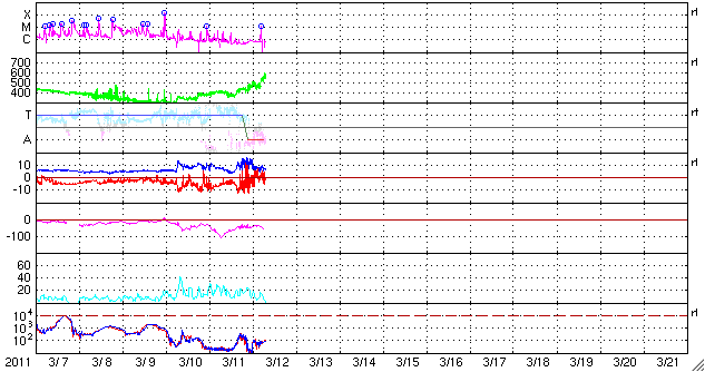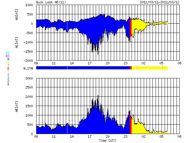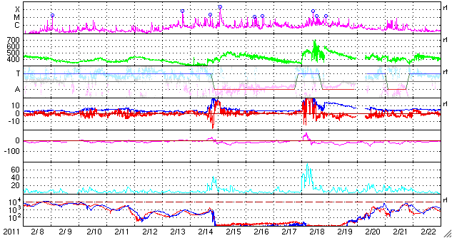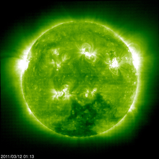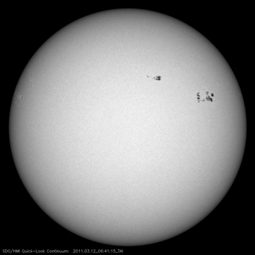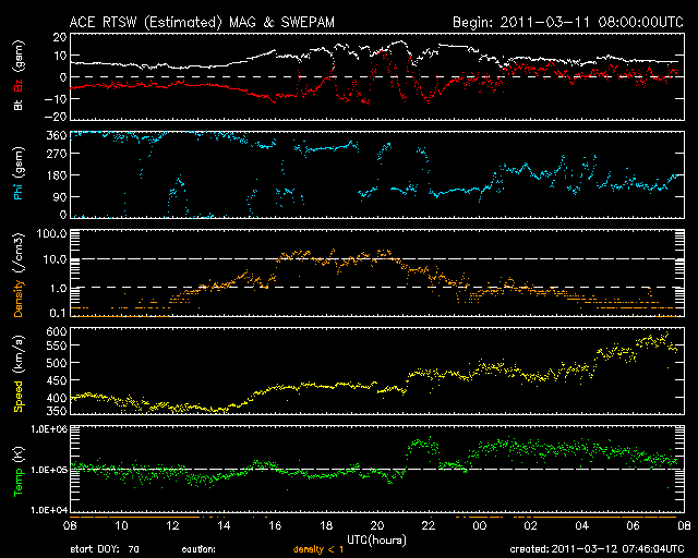 2011/ 3/12 16:47 更新 太陽のフレア活動は弱まりつつあります。太陽風の磁場が強まり、激しい磁気圏活動が発生しています。 担当 篠原 太陽のフレア活動は、落ち着きつつあるようです。 昨日のニュースの後、C5.5やC4.3などの小規模フレアが発生し、 その後、半日ほど目立ったフレアは起きませんでした。 しかし、12日13時半(世界時12日4時半)に、 1166黒点群で、M1.3の中規模フレアが発生しました。 X線のグラフを見ても、活動度は下がりつつあるようですが、 まだ、1166黒点群が大きな姿を見せている間は、 注意が必要でしょう。 太陽風は、昨夜、12日0時頃(世界時11日15時)に、 乱れの第二弾がやって来ました。 速度はあまり変わりませんでしたが、 磁場強度が15nTを超えるほどの強さになったのです。 さらに、南北成分は南向きになり、 -10nTの強い南向きが長い時間続きました。 この影響で、AE指数は最大2000nTに達する、 たいへん激しい変動を記録しています。 私はリアルタイムのデータを見ることができなかったのですが、 かなり華々しいオーロラ活動が見られたのではないでしょうか。 現在の太陽風の速度は、550km/秒に高まっています。 磁場強度は弱まりかけていますが、まだ8nTほどあります。 南北成分は0nT付近に変わっていますが、 また南よりに傾向が変われば、活発なオーロラを起こすでしょう。 こちらも注目が必要です。 今日は、種子島にぃます。 こちらも津波警報が出され、 大会のスケジュールは大きく変更されています。 今日は、更新がすっかり遅くなりました。 内容も簡単な報告で申し訳ありません。 SOHO衛星のEIT195カメラによる太陽コロナの様子 (c) SOHO (ESA & NASA) ![]() SDO衛星による太陽の可視光写真 (c) SDO (NASA) ![]() GOES衛星の太陽X線データ (c) NOAA/SWPC ![]() ACEが観測した太陽風の磁場(1番上の枠、白線は全体の強度、赤線は南北成分) および、太陽風の密度(3番目の橙線)、速度(4番目の黄線) (c) NOAA/SWPC ![]() リアルタイムAE指数 下段のAEグラフの値が高くなると、オーロラ活動が活発化しています。 (c) 京都大学, NICT ![]() 27日の太陽周期に合わせたデータプロット 太陽が同じ面を地球に向けていた27日前の変化から、今後を予想することができます。 (c) 作図:宇宙天気ニュース