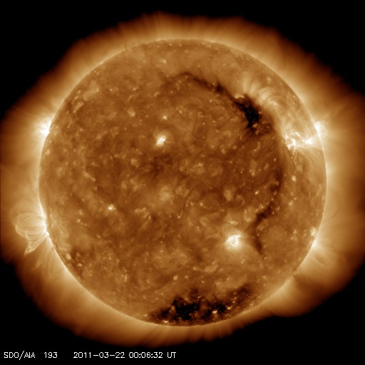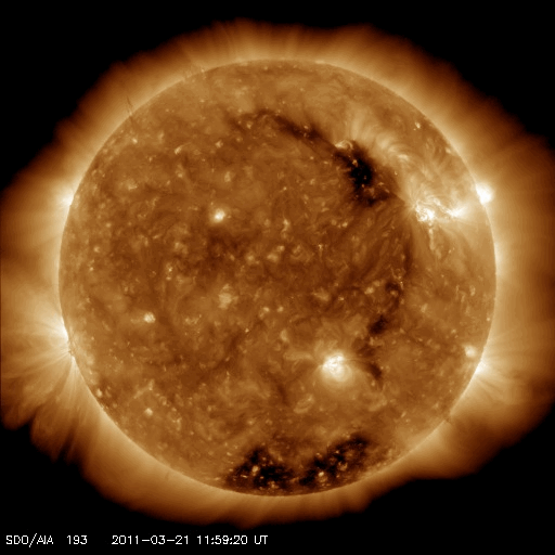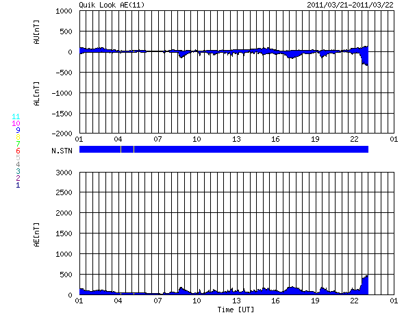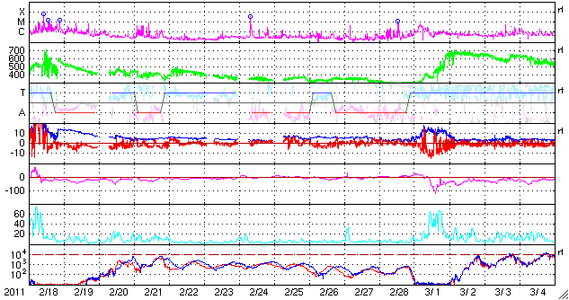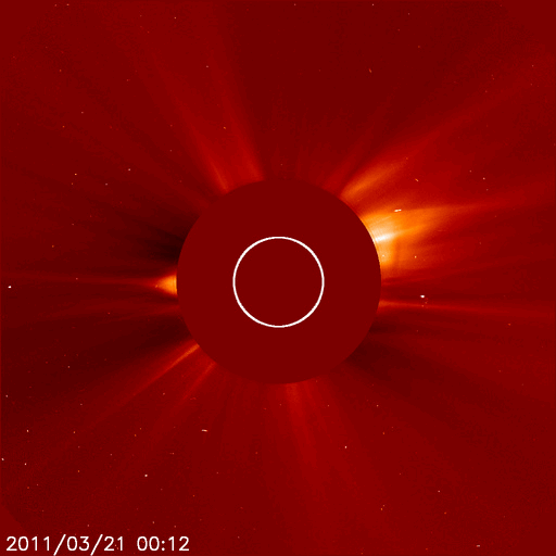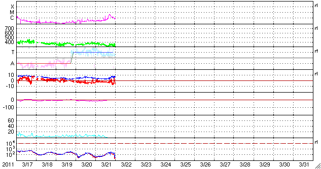 2011/ 3/22 09:40 更新 太陽の東端から黒点群が上がってきました。太陽風は高速風が近づいているかもしれません。 担当 篠原 今日は太陽がにぎやかです。 まず、4日ほど前に西端に沈んで行った1169黒点群が、 太陽の向こう側で大きなフレアを起こしました。 これにより太陽の西側から大きなCME(太陽ガスの放出現象)が飛び出しています。 SOHO LASCO C2、C3の動画を掲載します。 だいたい同じ時刻から、太陽放射線(速度が非常に高いプロトン粒子)が増加しています。 太陽の向こう側のこのフレアの影響ではないかと思われます。 そして、22日2時(世界時21日17時)に、C4.2の小規模フレアが発生しました。 こちらは、東端にぎりぎりで顔を出した1176黒点群が起こしています。 SDOのAIA193の動画では、フレアの後のループプロミネンスがきれいに見えています。 この1176黒点群は、2週間ほど前まで1165黒点群として見えていた黒点群です。 向こう側を半周して戻ってきました。 現在の活動度はどの程度か、注目してください。 太陽風は、今日の未明から磁場強度が8nTほどにやや強まっています。 コロナホールの影響が近づいているのかもしれません。 速度にはまだ変化はなく、340km/秒と低速のままです。 引き続き、太陽風の変化に注目してください。 太陽風磁場の南北成分は、南寄りに推移しています。 今朝からは、-5nTとある程度の強さで南向きになっていますが、 速度が遅いためか、AE指数はあまり目立った変化はしていません。 こちらも今後の推移に注目してください。 太陽の向こう側からCMEが飛び出しました。 (c) SOHO (ESA & NASA)、動画加工 : 宇宙天気ニュース ![]() 太陽の東端の新しい黒点群でC4.2のフレアが発生しました。 (c) SDO (NASA)、動画加工 : 宇宙天気ニュース ![]() SDO衛星のAIA193カメラによる太陽コロナの様子 (c) SDO (NASA) ![]() SDO衛星による太陽の可視光写真。マウスの矢印を写真に重ねると、黒点番号付きの写真に切り替わります。 (c) SDO (NASA) ![]() GOES衛星の太陽X線データ (c) NOAA/SWPC ![]() GOES衛星の太陽放射線データ (c) NOAA/SWPC ![]() ACEが観測した太陽風の磁場(1番上の枠、白線は全体の強度、赤線は南北成分) および、太陽風の密度(3番目の橙線)、速度(4番目の黄線) (c) NOAA/SWPC ![]() リアルタイムAE指数 下段のAEグラフの値が高くなると、オーロラ活動が活発化しています。 (c) 京都大学, NICT ![]() 27日の太陽周期に合わせたデータプロット 太陽が同じ面を地球に向けていた27日前の変化から、今後を予想することができます。 (c) 作図:宇宙天気ニュース