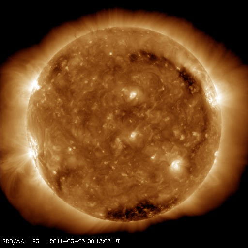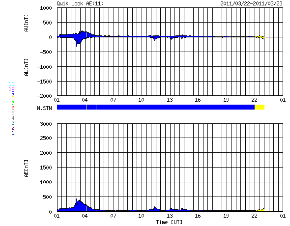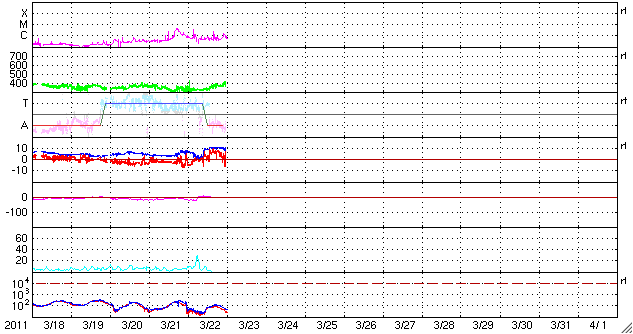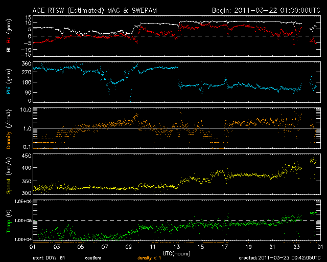 2011/ 3/23 09:42 更新 太陽の東端の南北に活動的な領域が見えています。太陽風は400km/秒台に上がっています。 担当 篠原 太陽の南東(左下)から、1176黒点群の大きな姿が見えてきました。 昨日から今日にかけて、C3.9、C1.6などの小規模フレアを起こしています。 また、黒点は見えませんが、 東端の北半球側からも活動的な領域が現われています. SDOのAIA193を見ると、東端は南北ともに明るく輝いて見えます。 小規模から中規模のフレア活動が今後も見られそうです。 昨日上昇をお知らせした太陽放射線は、 既に低下に向かっています。 太陽風は、昨日のニュース以降も330km/秒ほどの低速状態が続きました。 そして、昨日の午後に再びセクター境界がやって来て、 太陽風磁場の大まかな方向は、Toward(地球から太陽向き)から、 Away(太陽から地球向き)に切り替わりました。 これとともに太陽風の状況が少し変化したようで、 磁場強度は10nTに強まり、 速度もゆっくり上がって430km/秒と平均レベルに達しています。 磁場強度は、先ほど5nT近くに下がっています。 コロナホールの影響もあるのかもしれません。 しかし、これ以上大きな変化になることはなさそうです。 やがて、低速風に戻るのではないかと思われます。 太陽風磁場は強まりましたが、南北成分は北を向き続け、 磁気圏は静穏です。 AE指数は小さな変化がいくつか見られるだけです。 SDO衛星のAIA193カメラによる太陽コロナの様子 (c) SDO (NASA) ![]() SDO衛星による太陽の可視光写真。マウスの矢印を写真に重ねると、黒点番号付きの写真に切り替わります。 (c) SDO (NASA) ![]() GOES衛星の太陽X線データ (c) NOAA/SWPC ![]() GOES衛星の太陽放射線データ (c) NOAA/SWPC ![]() ACEが観測した太陽風の磁場(1番上の枠、白線は全体の強度、赤線は南北成分) および、太陽風の密度(3番目の橙線)、速度(4番目の黄線) (c) NOAA/SWPC ![]() リアルタイムAE指数 下段のAEグラフの値が高くなると、オーロラ活動が活発化しています。 (c) 京都大学, NICT ![]() 27日の太陽周期に合わせたデータプロット 太陽が同じ面を地球に向けていた27日前の変化から、今後を予想することができます。 (c) 作図:宇宙天気ニュース