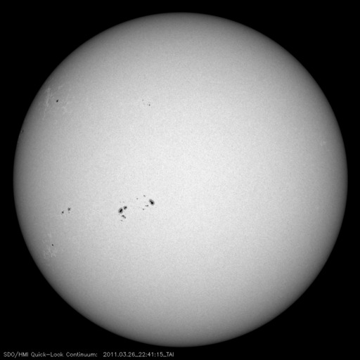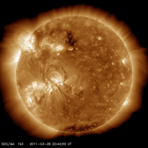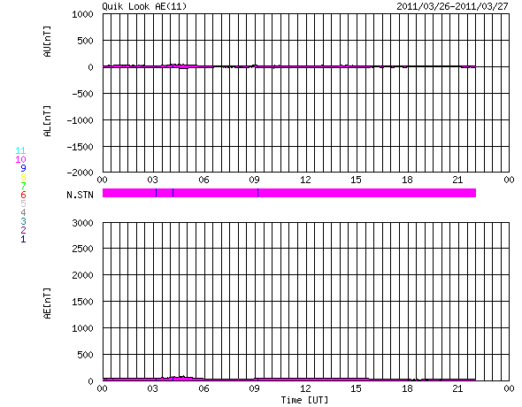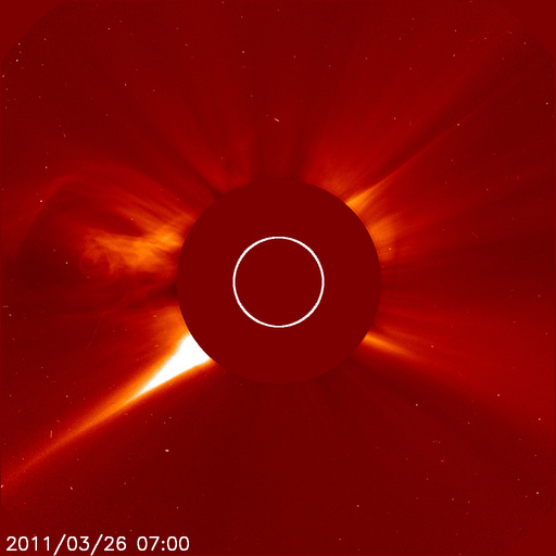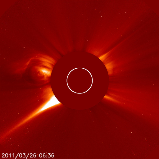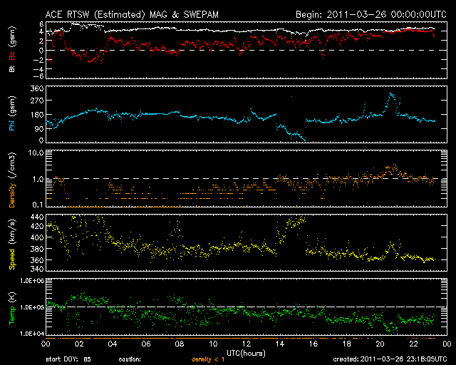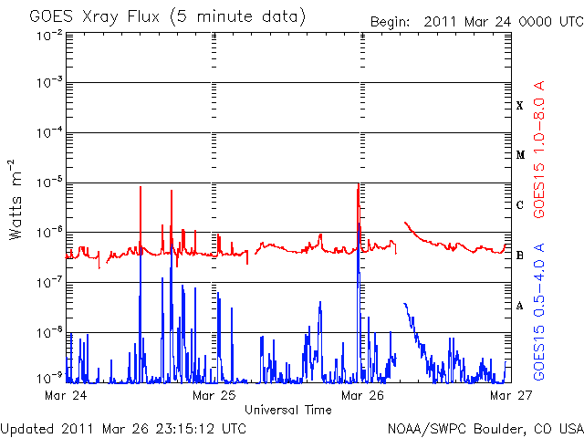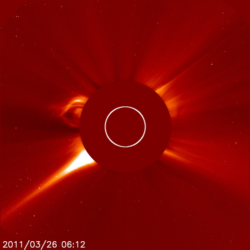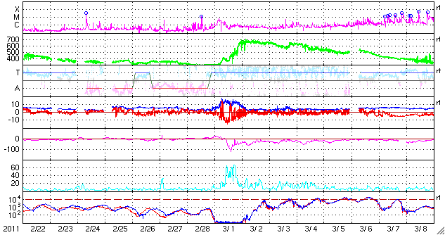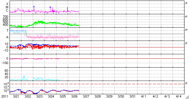 2011/ 3/27 08:18 更新 M1.0の中規模フレアが発生しています。太陽風は低速で穏やかです。 担当 篠原 1176黒点群は、26日7時(世界時25日23 時)に M1.0の中規模フレアを起こしました。 黒点はまだ大きく広がっていて、 引き続き活動に注目が必要です。 GOESのX線グラフによると、 26日16時(世界時26日7時)頃にも、 Cクラスに達する変化が観測されています。 しかし、その直前のデータがなく、 フレアの正確なピークは分かりません。 これは、GOES衛星が地球の影に入って、 太陽が見えなくなっていたためです。 太陽の東端から、新しい黒点群が上がっています。 活動に注目です。 また、SOHO LASCOカメラによると、 CMEが発生しています。 太陽の向こう側の現象のようです。 太陽風は、速度は360km/秒に下がっています。 磁場強度は、5nT前後で安定し、 南北成分はほとんどの時間で北向きでした。 このため磁気圏も静穏で、 AE指数は全く変化していません。 この後も、穏やかな太陽風が続きそうです。 SOHO衛星 LASCO C2カメラの映像 (c) SOHO (ESA & NASA)