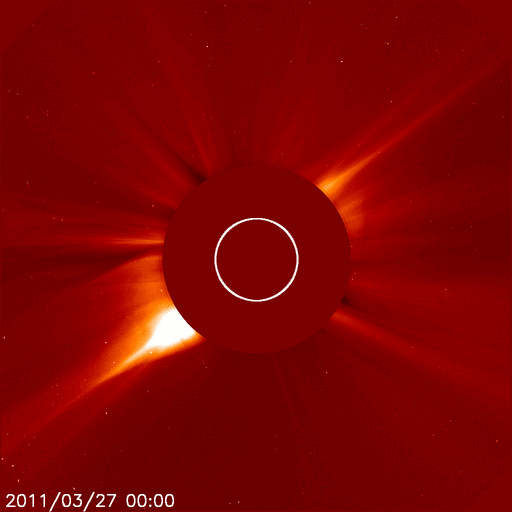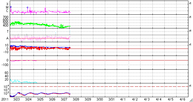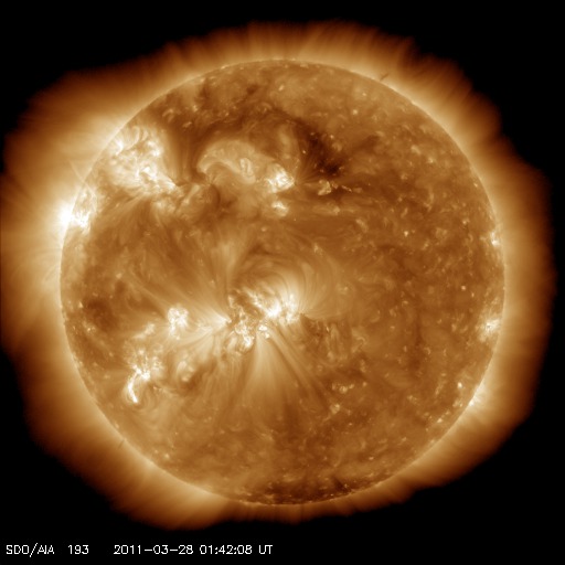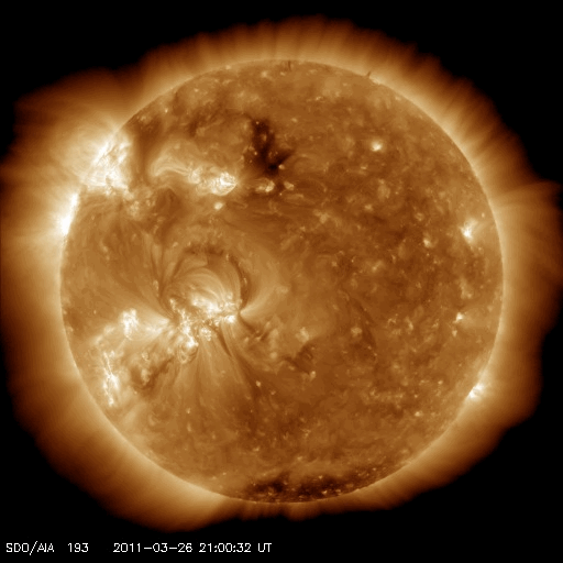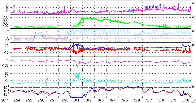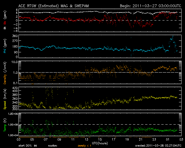 2011/ 3/28 11:27 更新 太陽に黒点が目立っています。太陽風は低速で穏やかです。 担当 篠原 太陽面の黒点がとてもにぎやかになっています。 今日は更に黒点群のリストが増えています。 1176〜1181群までは、可視光写真にマウスを重ねると切り替わる、 群番号付きの写真で見つけることができます。 1182群は、1177群のすぐ南側(下側)にあるそうですが、 掲載の写真ではよく分かりません。 そして、1183群は東端(左端)の北半球側から上がってきている黒点群で、 規模も大きく、活動的の様です。 この他にも、西端(右端))の南半球側に小さな黒点が見えています。 この様に、太陽全体がとてもにぎやかです。 フレア活動は、太陽の中央付近に見える大きな1176黒点群が、 27日9時(世界時27日0時)に、C3.1の小規模フレアを起こし、 これに続く太陽東側の爆発的な変動をSDO衛星AIA193の動画で見ることができます。 変動は、27日14時(世界時27日5時)頃に東端でも起きていて、 これら一連の活動によるCMEをSOHO LASCO C2、C3が観測しています。 このCMEの一部は地球方向にも飛びだしていると見られ(NOAA/SWPC)、 30〜31日頃に影響がやって来るかもしれません。 しかし、太陽風の変化は小規模でしょう. 太陽風は、速度が360km/秒にやや上がっていますが、低速の風が続いています。 磁場強度も4nTで落ち着いていて、穏やかな状態です。 磁気圏のオーロラ活動も特に変化はなく、AE指数はとても静かです。 SDO AIA193では、北半球側にとても淡く小さなコロナホールがあります。 こちらも30〜31日くらいに影響が及ぶ可能性があります. タイミングとしては、CMEの変化と重なって区別はつかなくなるかもしれません。 こちらも規模は小さいので、やって来ても影響は限定的でしょう。 SDO衛星のAIA193カメラによる、1176群のC3フレアを含む太陽東側の変動。 (c) SDO (NASA)、動画加工 : 宇宙天気ニュース ![]() SOHO LASCO C2、C3カメラによる、CMEの様子。変動が重なって、見え方も複雑です。 (c) SOHO (ESA & NASA)、動画加工 : 宇宙天気ニュース ![]() SDO衛星のAIA193カメラによる太陽コロナの様子 (c) SDO (NASA) ![]() SDO衛星による太陽の可視光写真。マウスの矢印を写真に重ねると、黒点番号付きの写真に切り替わります。 (c) SDO (NASA) ![]() GOES衛星の太陽X線データ (c) NOAA/SWPC ![]() ACEが観測した太陽風の磁場(1番上の枠、白線は全体の強度、赤線は南北成分) および、太陽風の密度(3番目の橙線)、速度(4番目の黄線) (c) NOAA/SWPC ![]() リアルタイムAE指数 下段のAEグラフの値が高くなると、オーロラ活動が活発化しています。 (c) 京都大学, NICT ![]() 27日の太陽周期に合わせたデータプロット 太陽が同じ面を地球に向けていた27日前の変化から、今後を予想することができます。 (c) 作図:宇宙天気ニュース